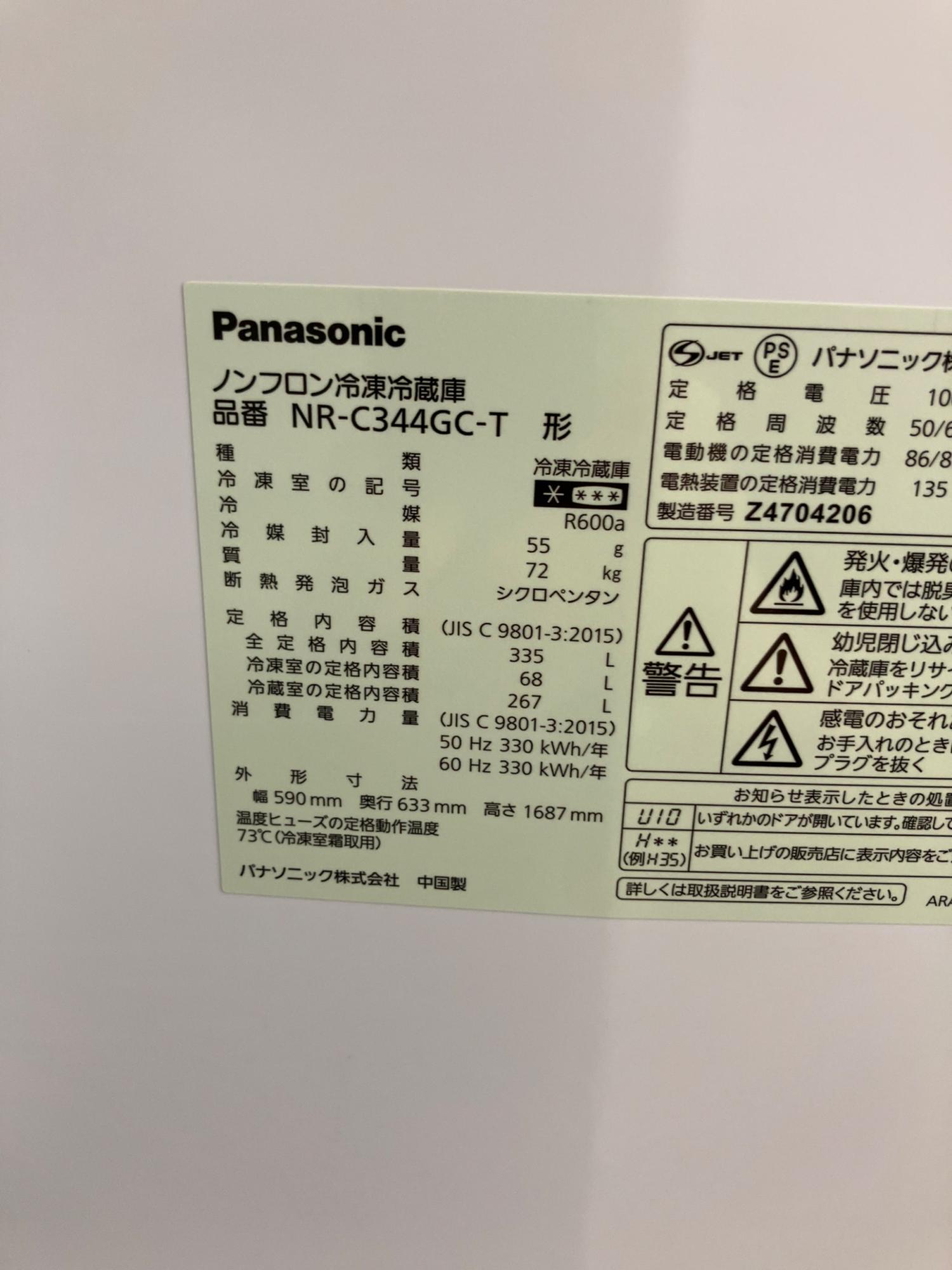Panasonic (パナソニック) 3ドア冷蔵庫 NR-C344GC-T 2024年製 自動製氷機能 335L