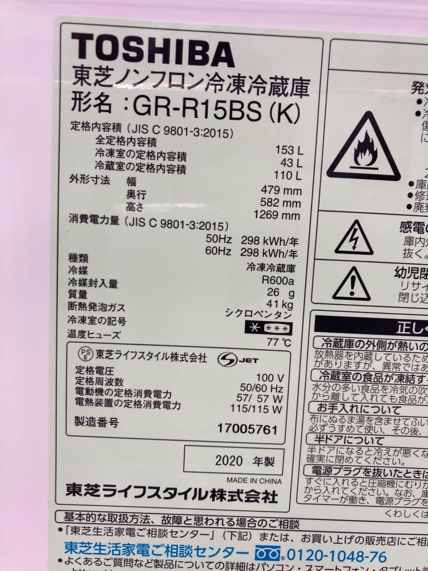 TOSHIBA (トウシバ) 2ドア冷蔵庫 221 GR-R15BS 2020年製 153L クリーニング済