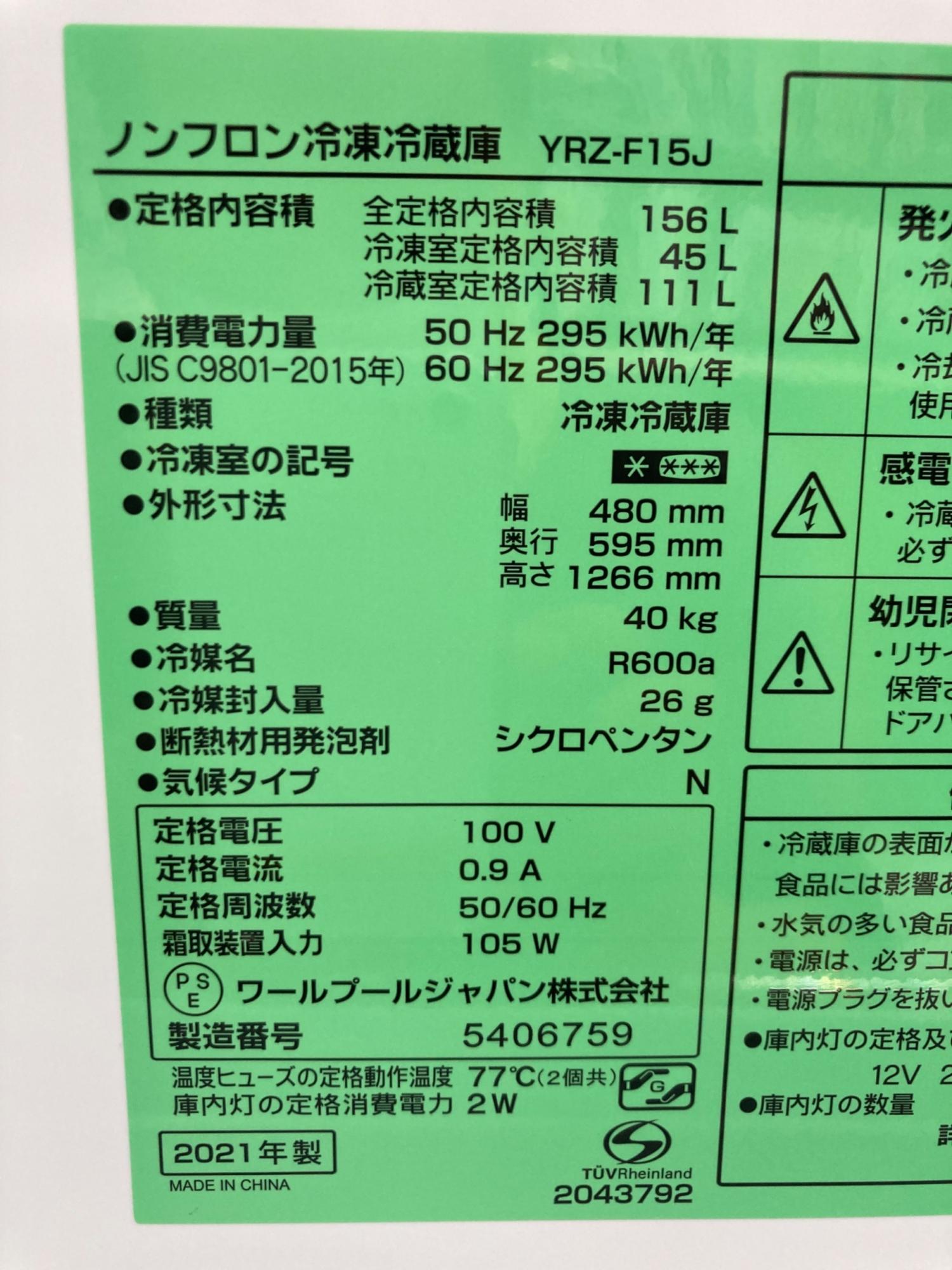 Y SELECT 2ドア冷蔵庫 YRZ-F15J 2021年製 156L クリーニング済