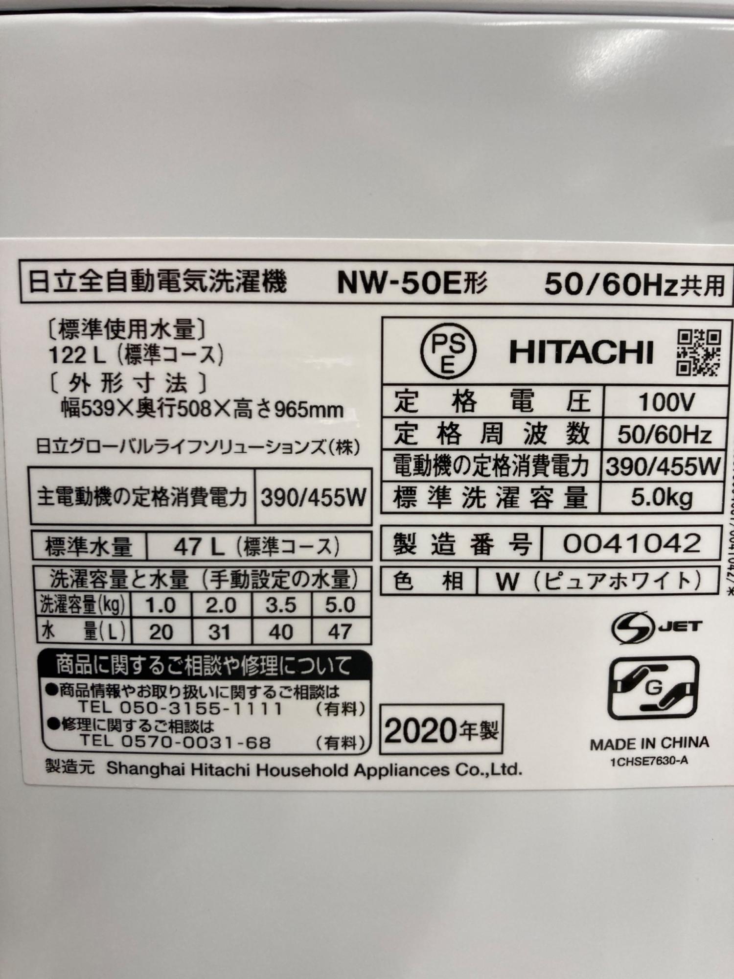 HITACHI (ヒタチ) 全自動洗濯機 5.0kg NW-50E 2020年製 クリーニング済
