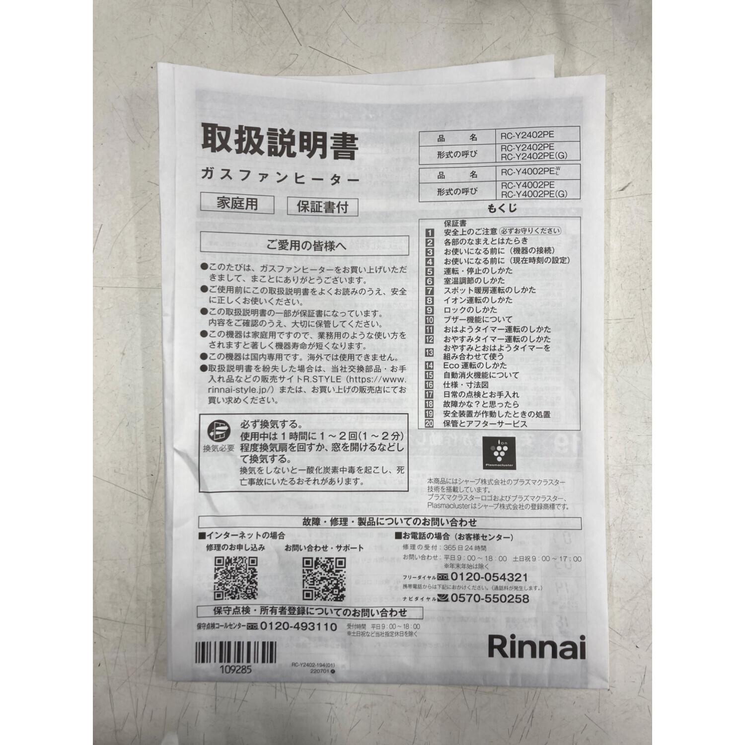 Rinnai (リンナイ) 都市ガスファンヒーター RC-Y2402PE 2023年製 PSTGマーク(都市ガス)有