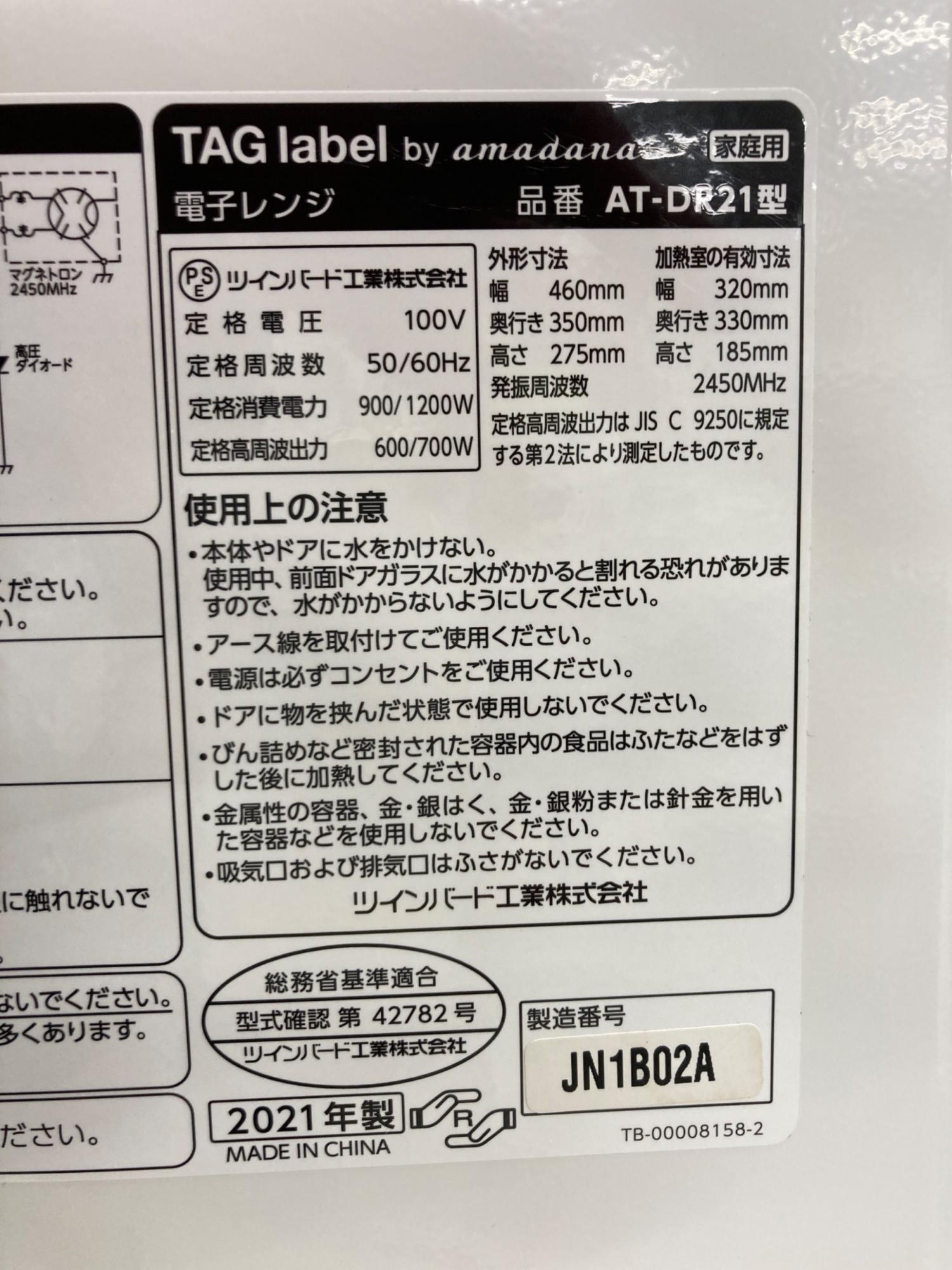 TWINBIRD (ツインバード) 電子レンジ AT-DR21 2021年製