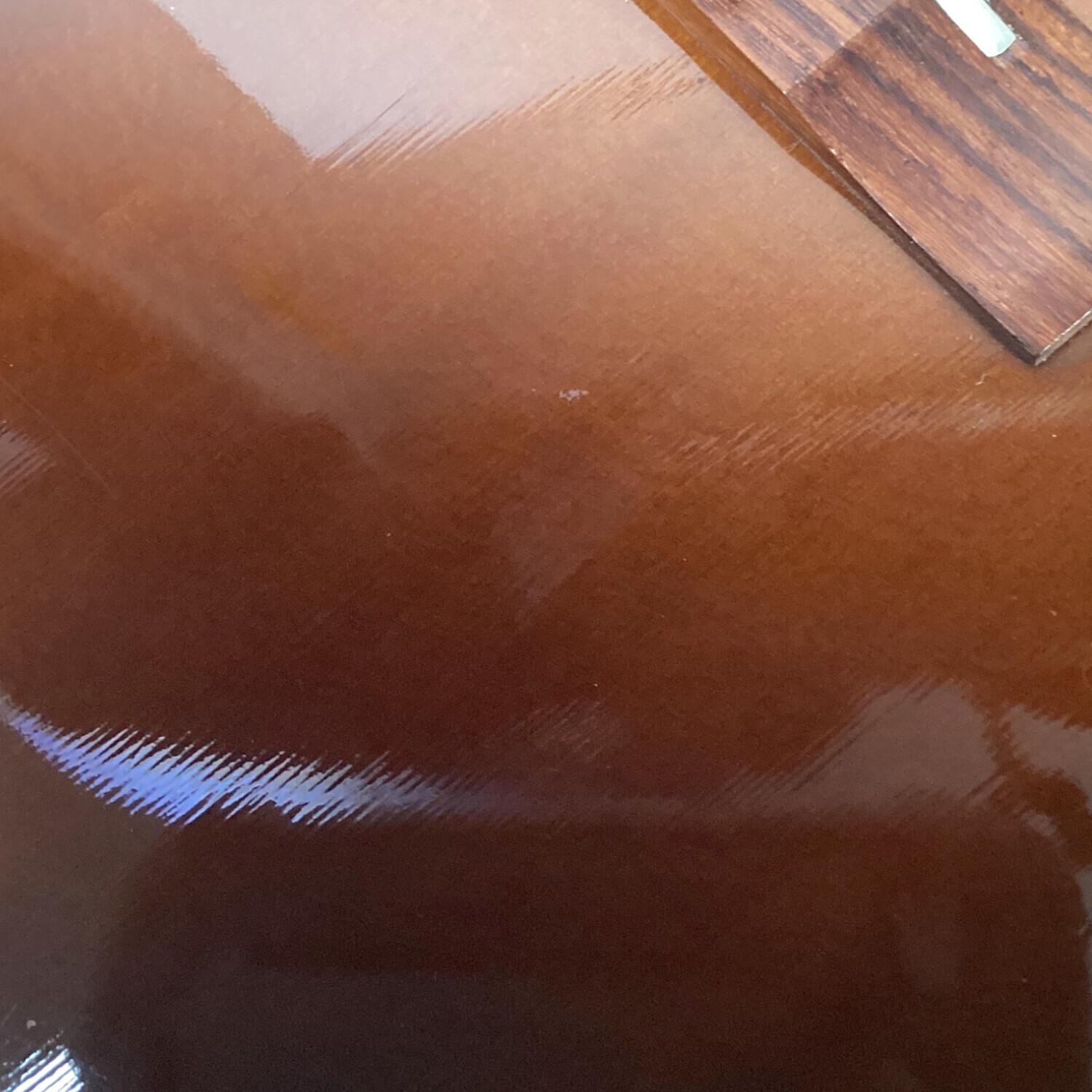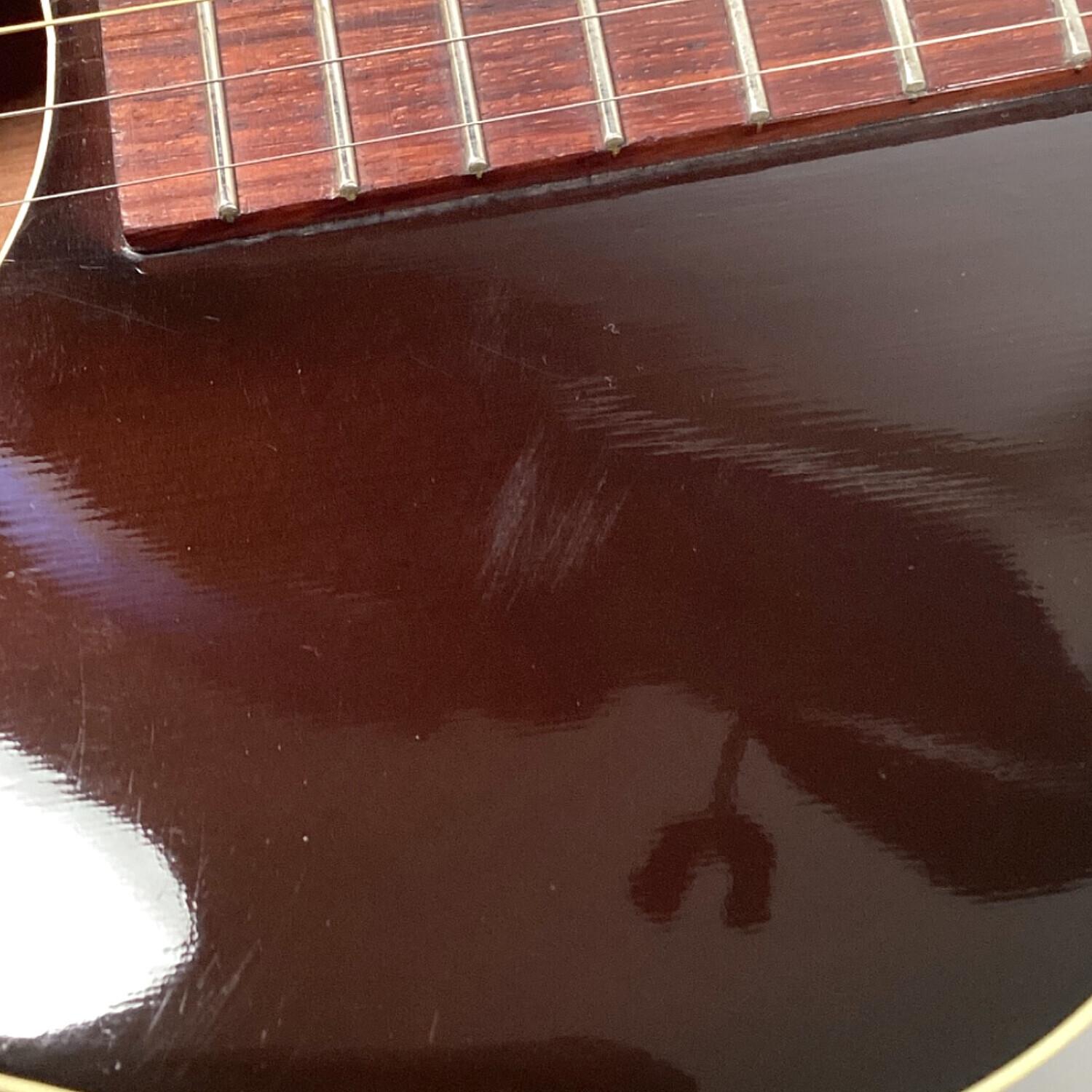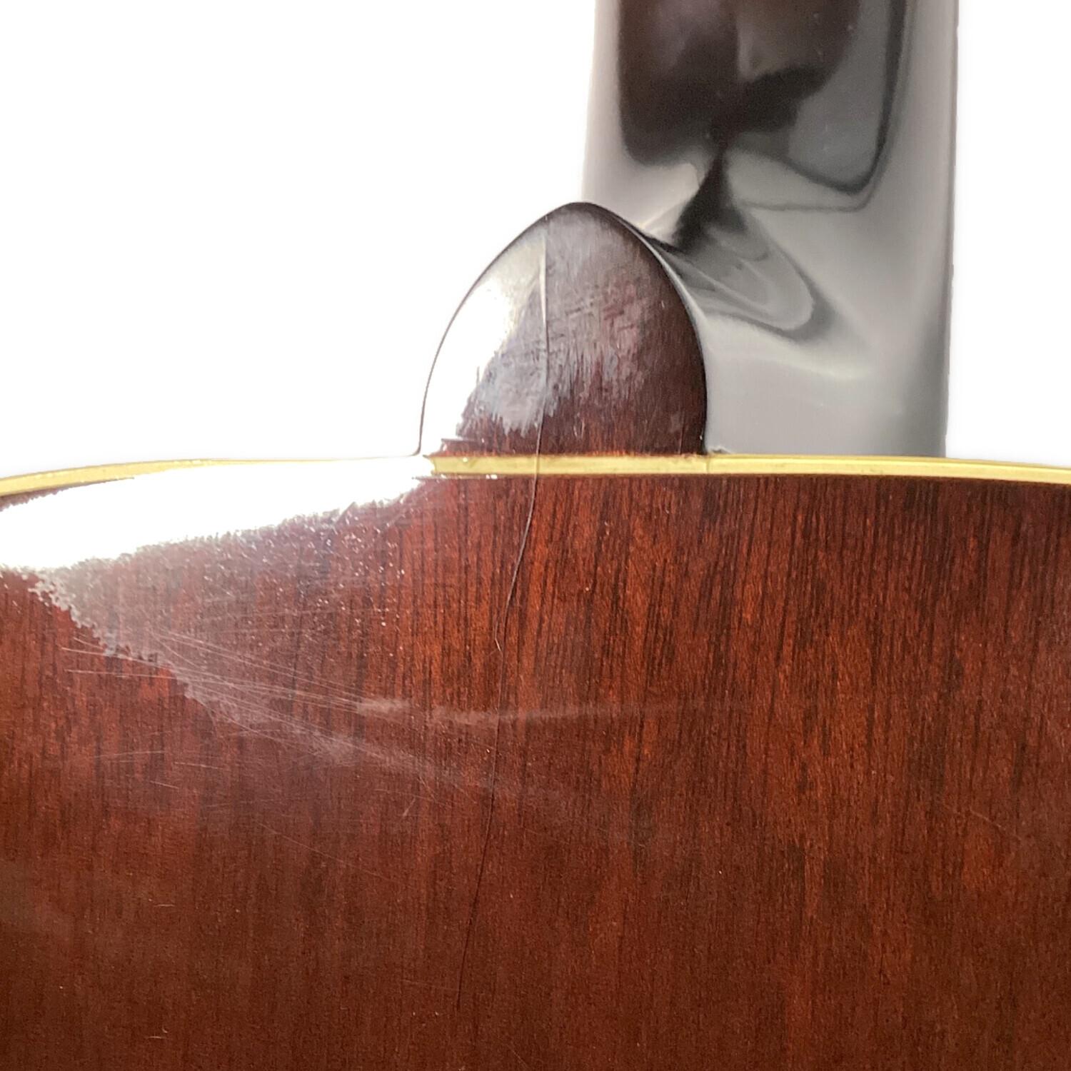 全体に演奏に伴うキズ有、背面ネック付け根にクラック有、画像では分かりづらいですが背面の一部に光を透かすと分かる程度のラッカーの劣化が見られます。