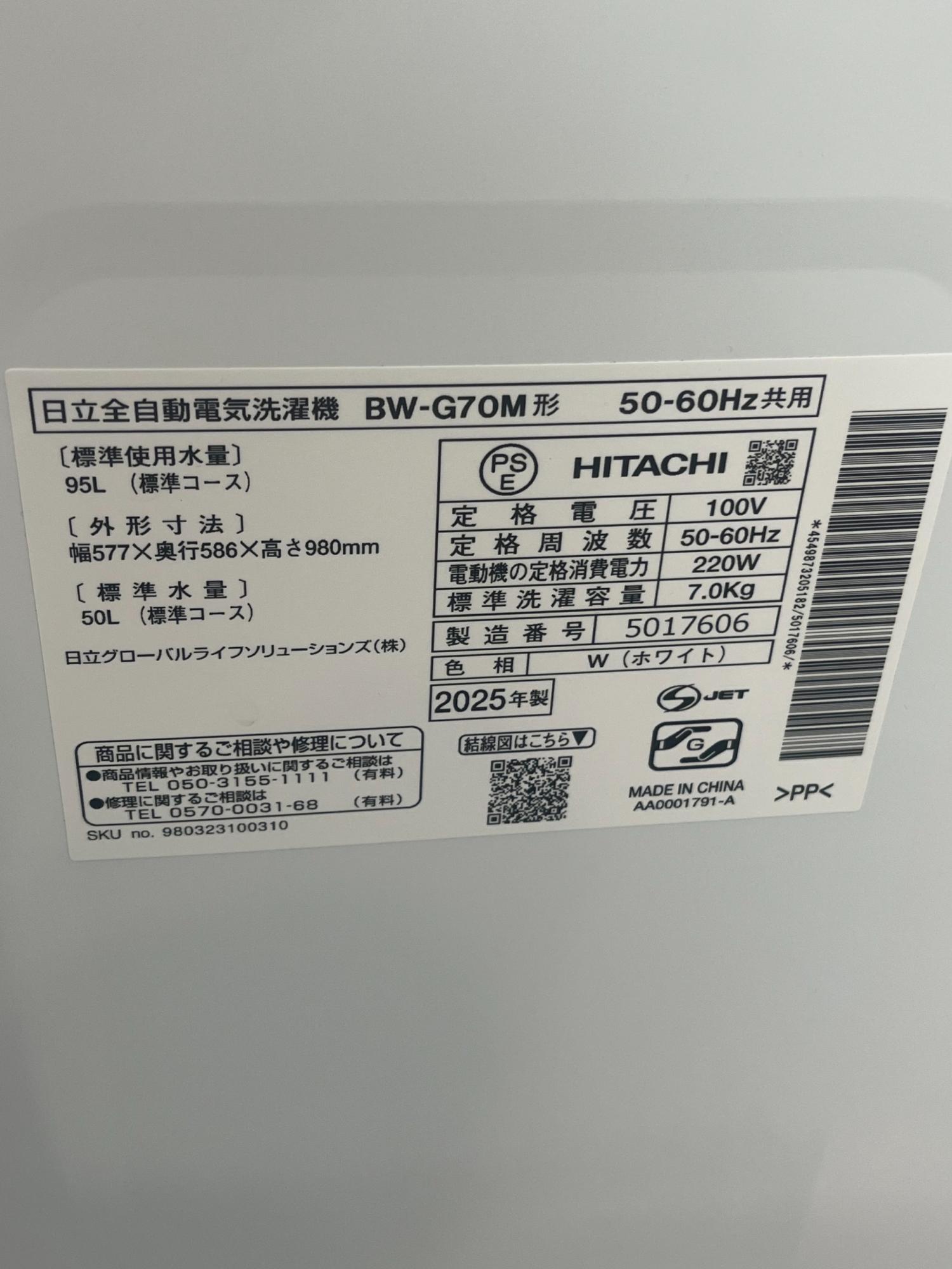 HITACHI (ヒタチ) 全自動洗濯機 BW-G70M 2025年製 キズ有