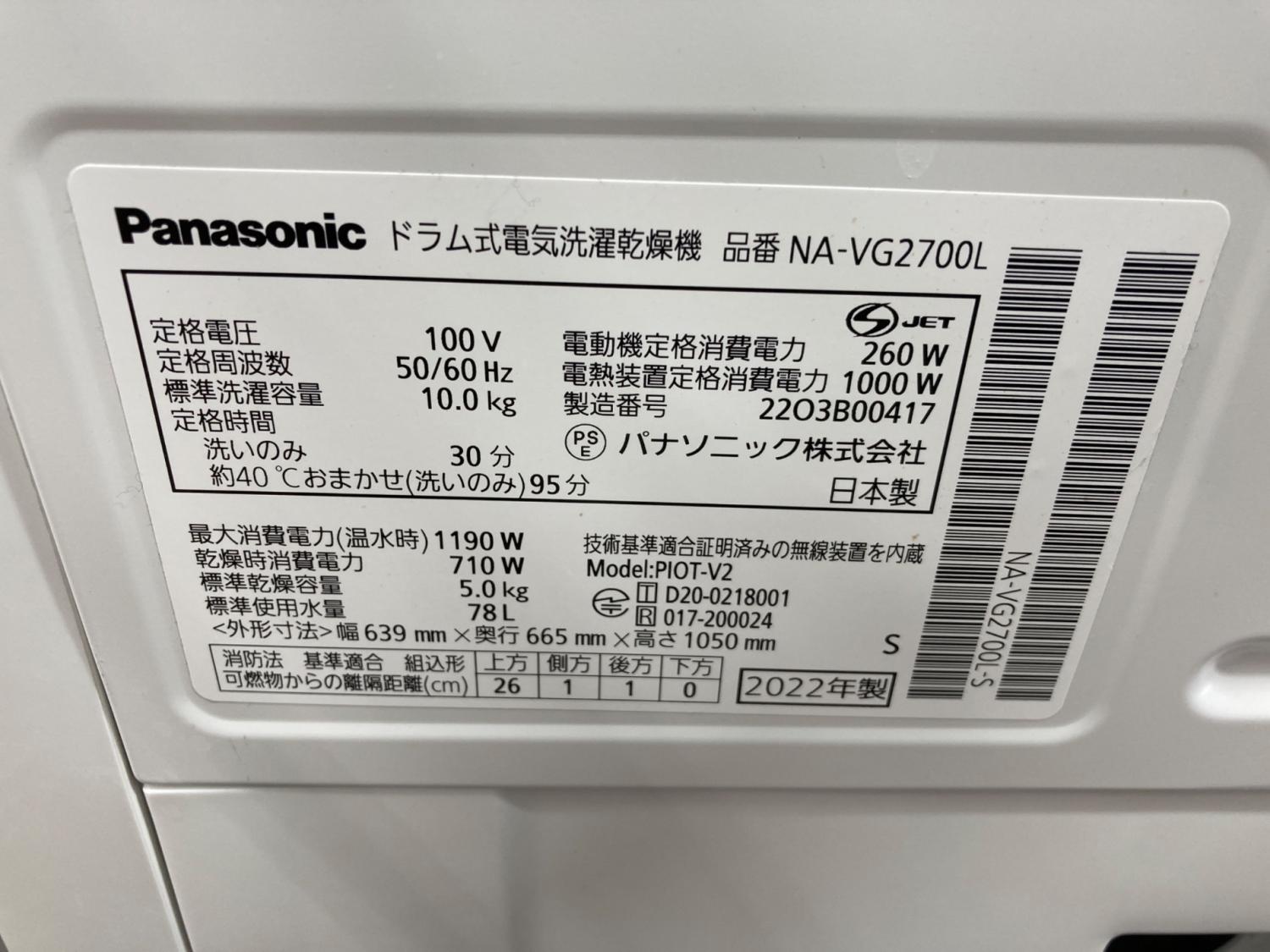 Panasonic (パナソニック) ドラム式洗濯乾燥機 NA-VG2700L 2022年製 22