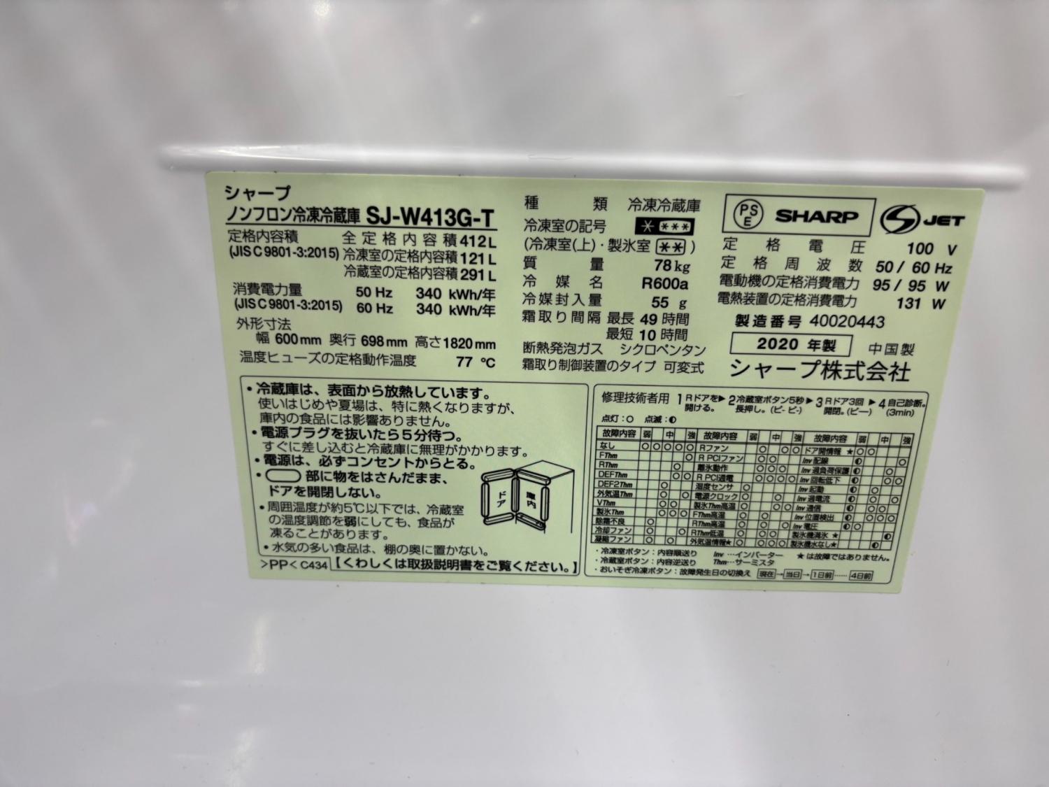 SHARP (シャープ) 5ドア冷蔵庫 SJ-W413G-T 2020年製 412L