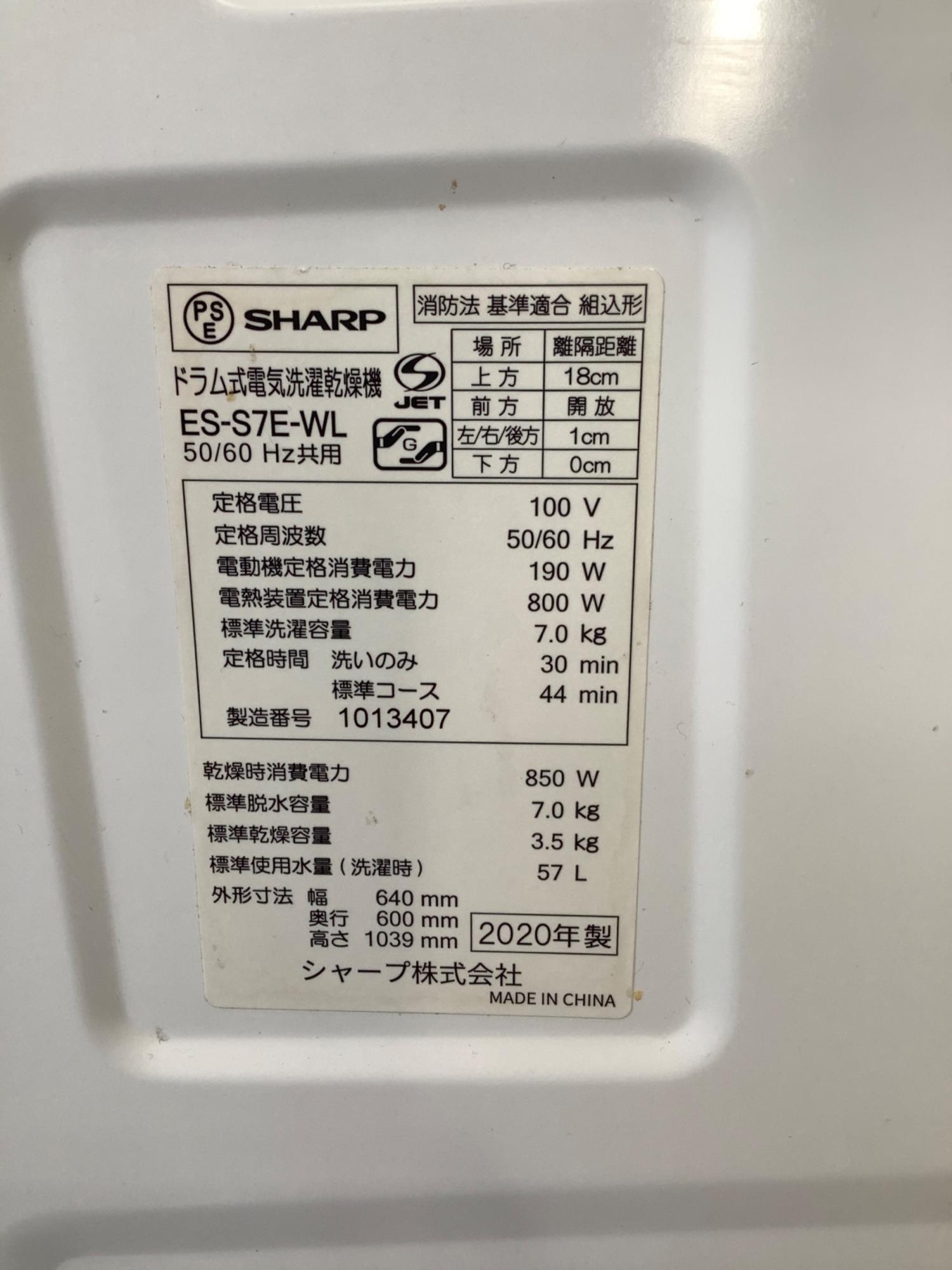 SHARP (シャープ) ドラム式洗濯乾燥機 ES-S7E-WL 2020年製