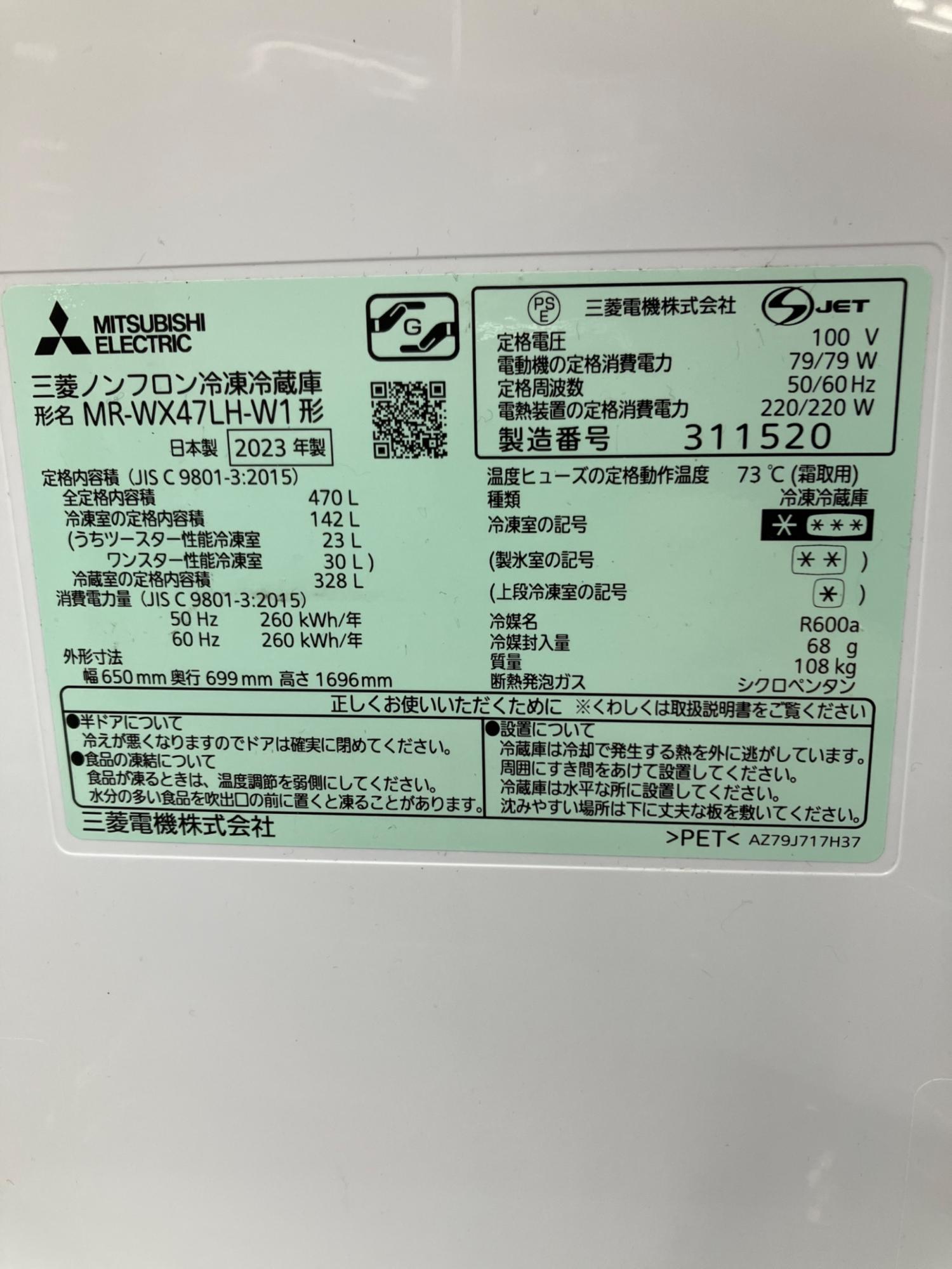 MITSUBISHI (ミツビシ) 6ドア冷蔵庫 MR-WX47LH-W1 2023年製 59 470L