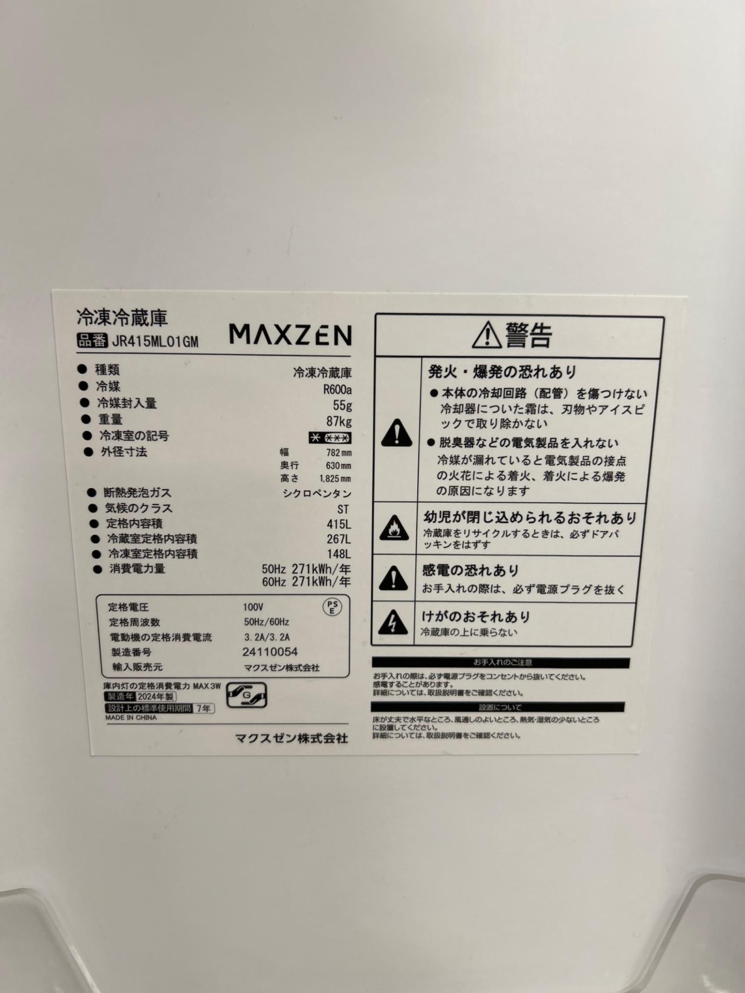 maxzen (マクスゼン) 4ドア冷蔵庫 JR415ML01GM 2024年製 415L