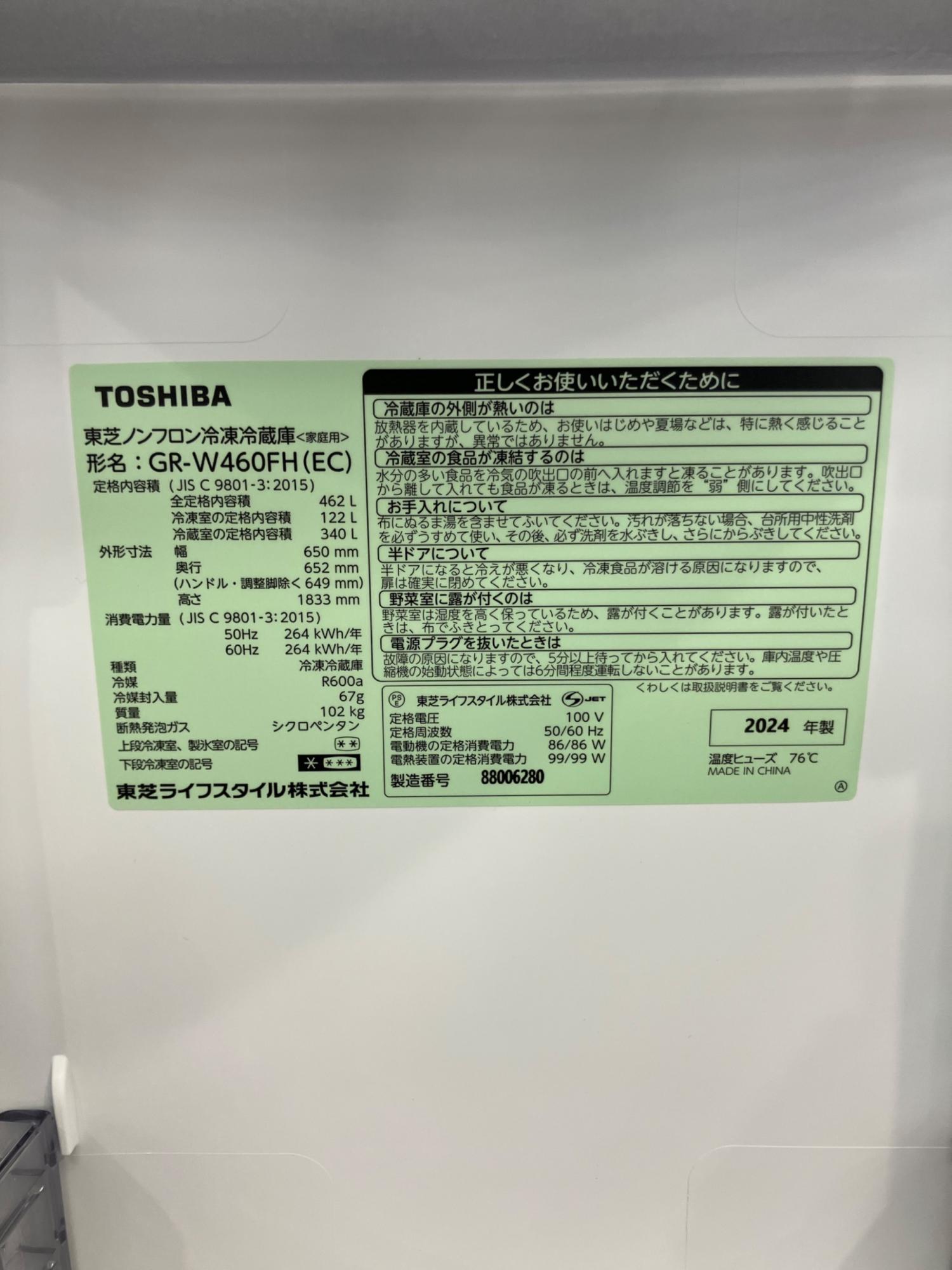 TOSHIBA (トウシバ) 6ドア冷蔵庫 GR-W460FH(EC) 2024年製 142 462L