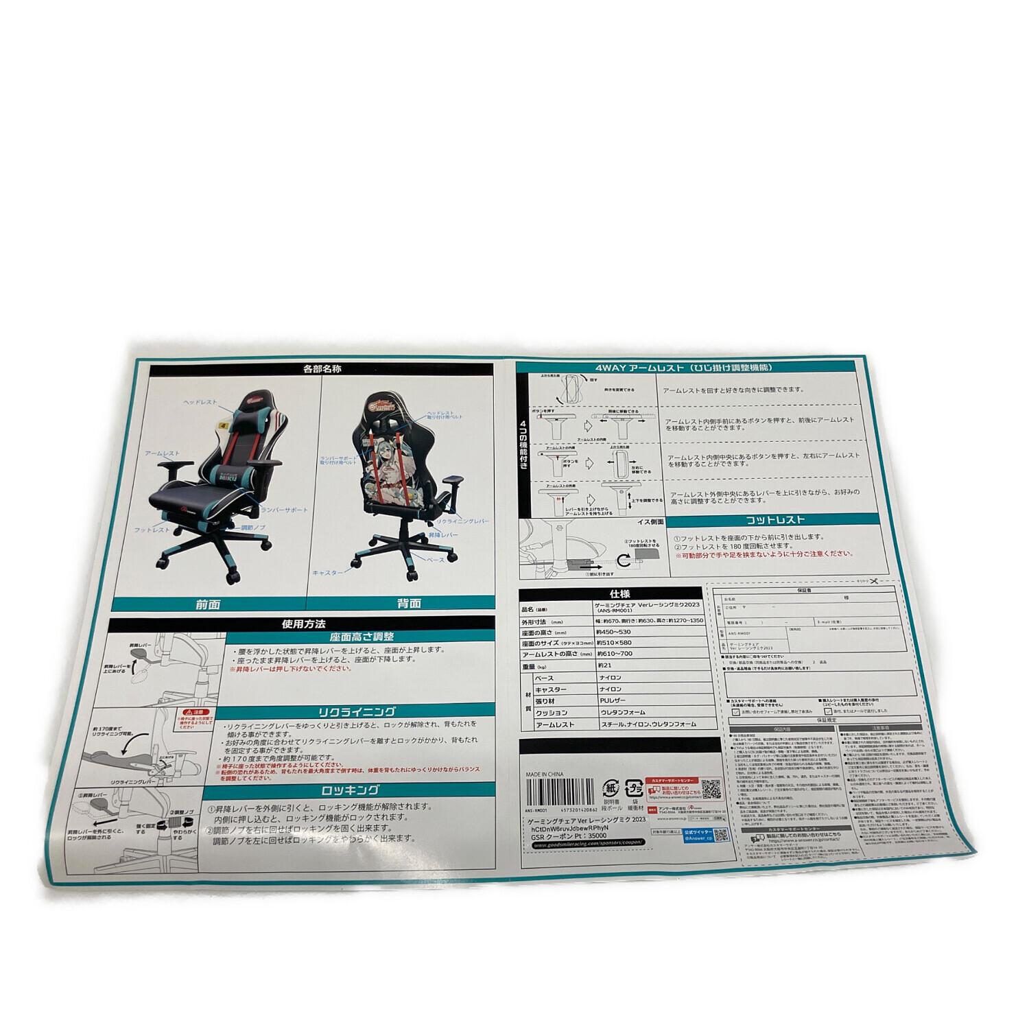 ANSWER (アンサー) ゲーミングチェア ANS-RM001 レーシングミク 2023Ver ブラック×ミントグリーン