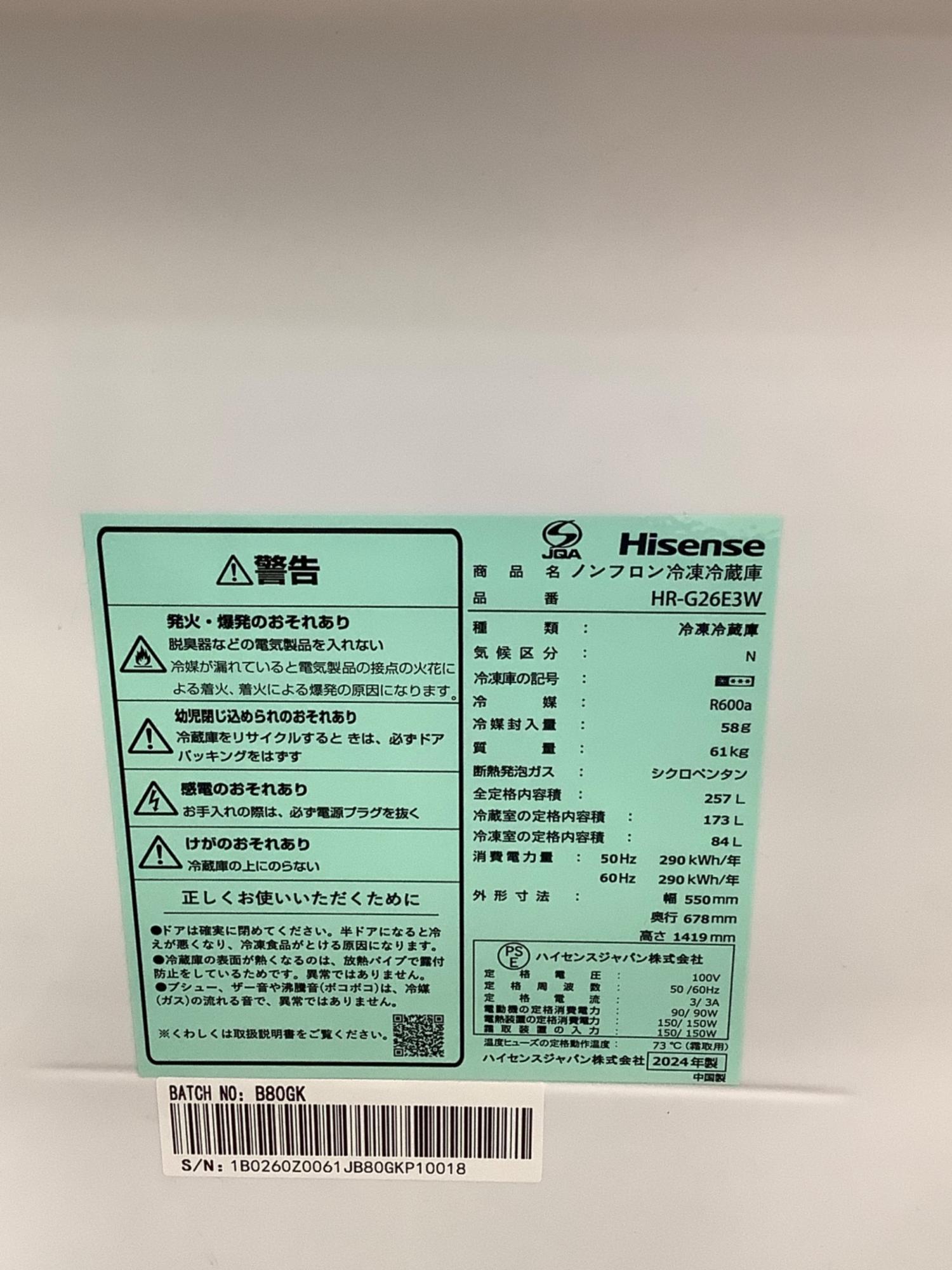 Hisense (ハイセンス) 2ドア冷蔵庫 HR-G26E3W 2024年製 257L 84L クリーニング済