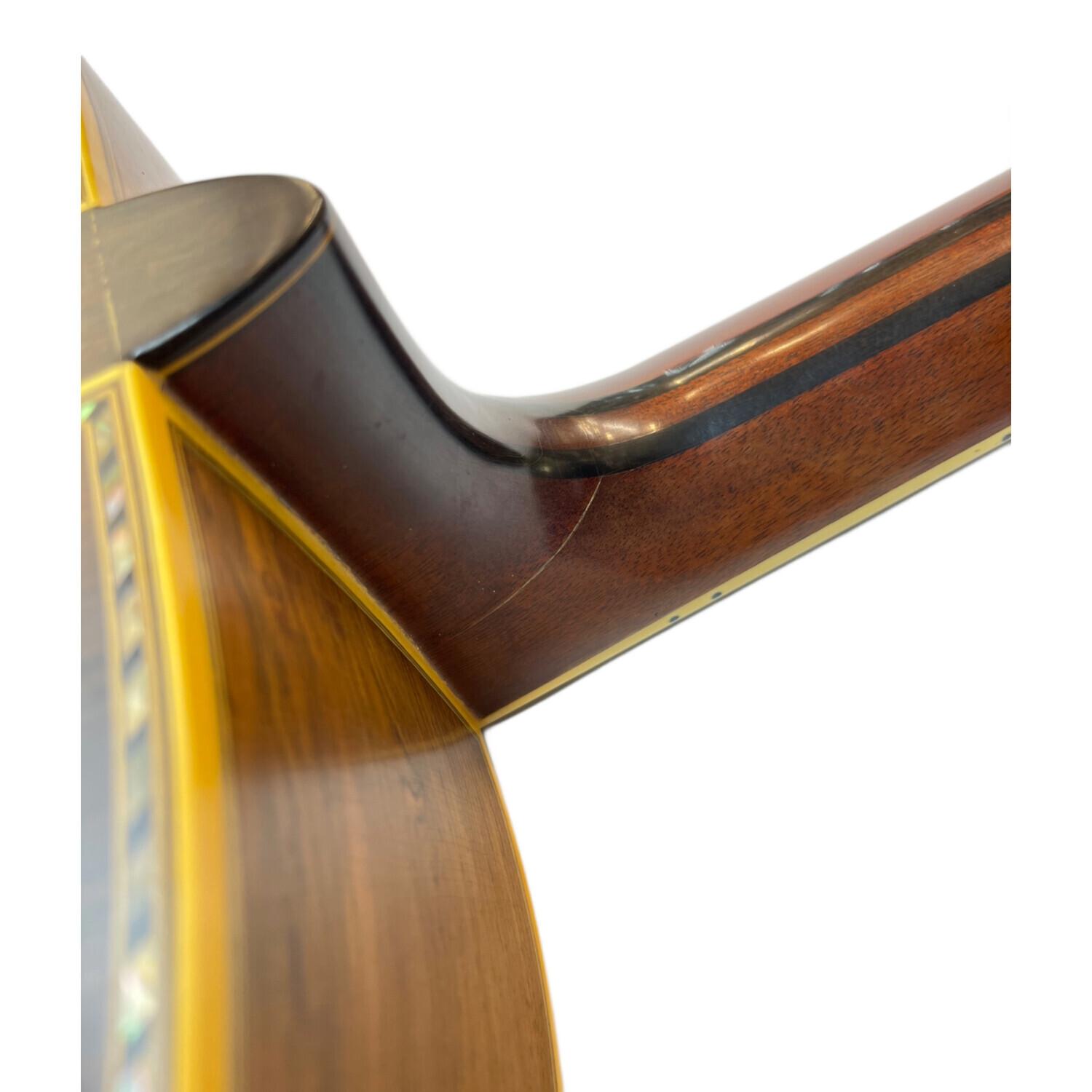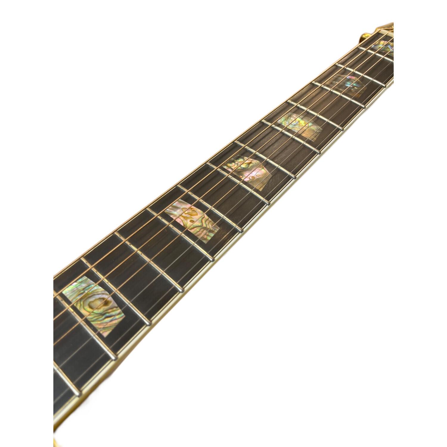 1975年~1980年まで販売されL四天王とファンの間で呼ばれた希少なモデルで、アバロン貝をふんだんに使ったボディパーフリング、ロゼッタ、ヘッドインレイ、フィンガーボードのインレイは、手の込んだ細工の上品な仕上げとなっており、伝統工芸品のような一点物の仕上がり