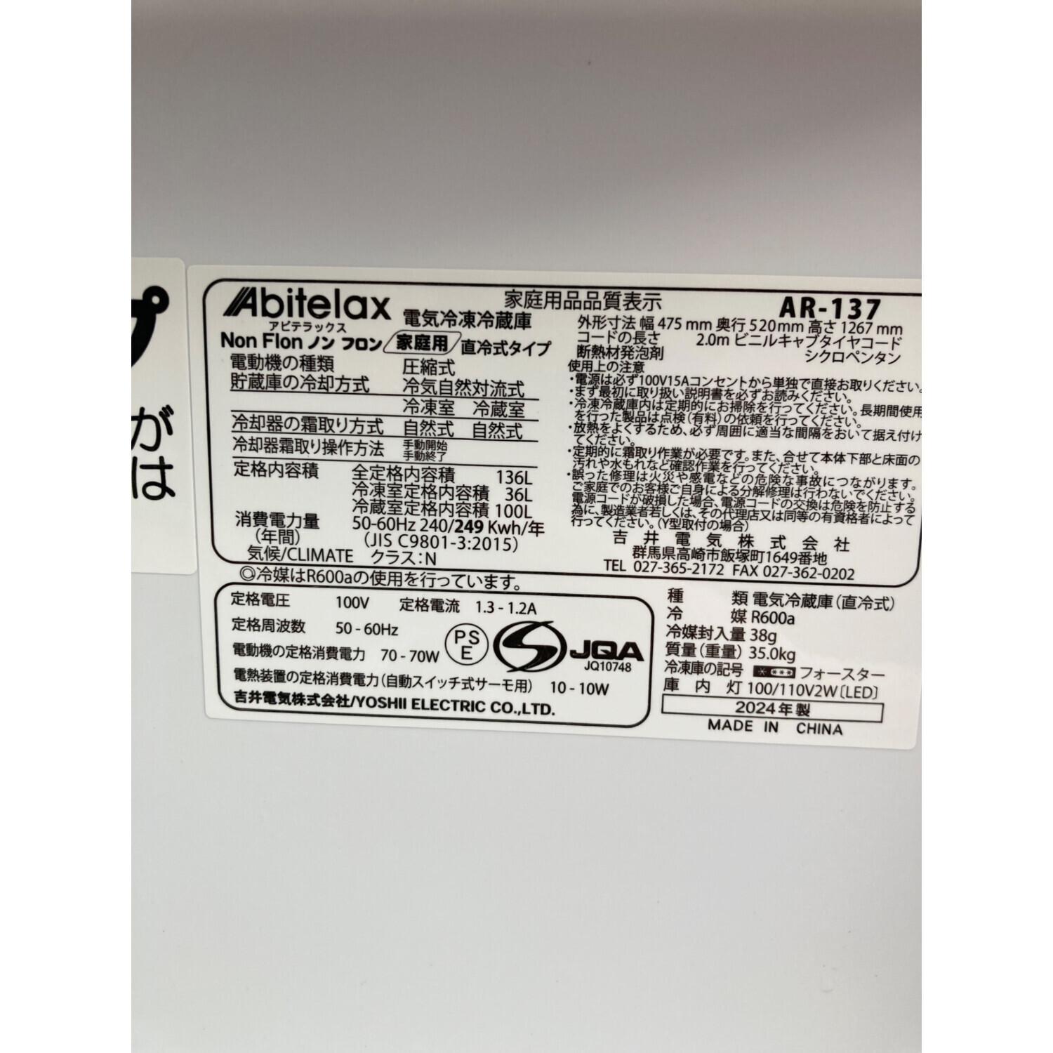 Abitelax (アビテラックス) 2ドア冷蔵庫 AR-137 2024年製 136L クリーニング済