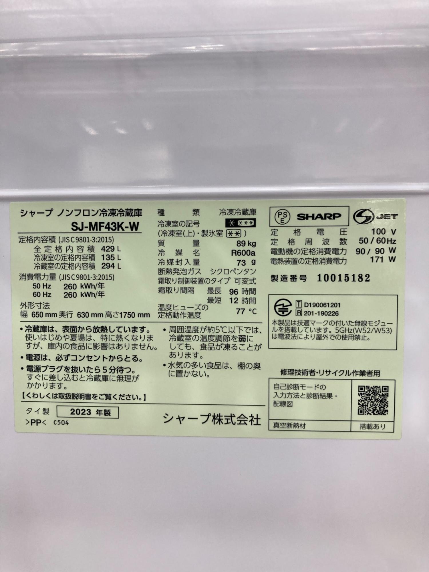 SHARP (シャープ) 6ドア冷蔵庫 SJ-MF43-W 2023年製 429L