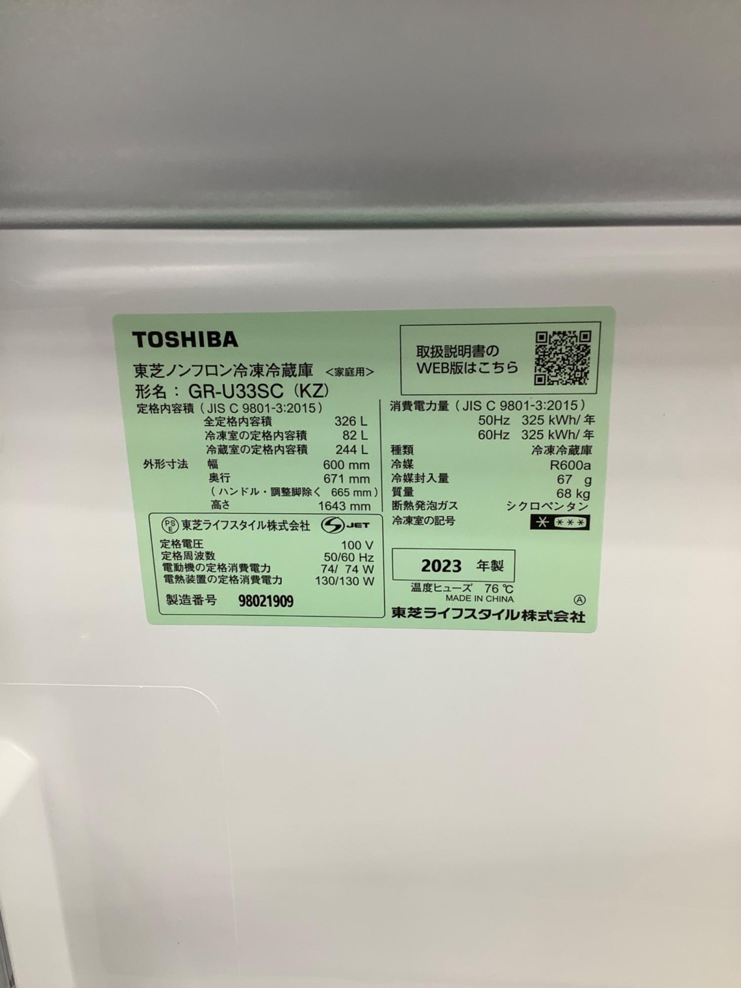 TOSHIBA (トウシバ) 3ドア冷蔵庫 側面ヘコミ有 GR-U33SC 2023年製 326L