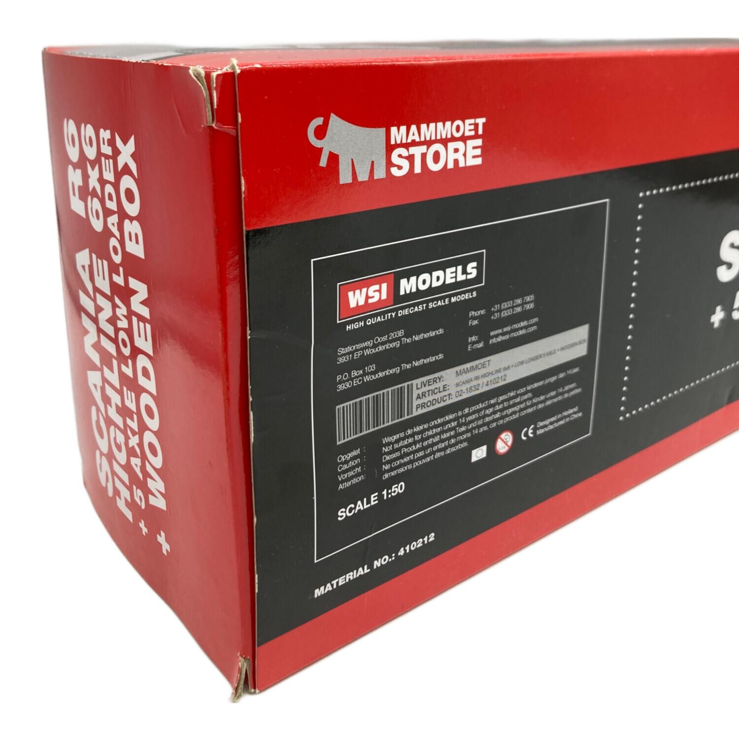 MAMMOET STORE ミニカー 箱スレ有 Scania R6 Highline 6x6 + 5 axle low loader + wooden box