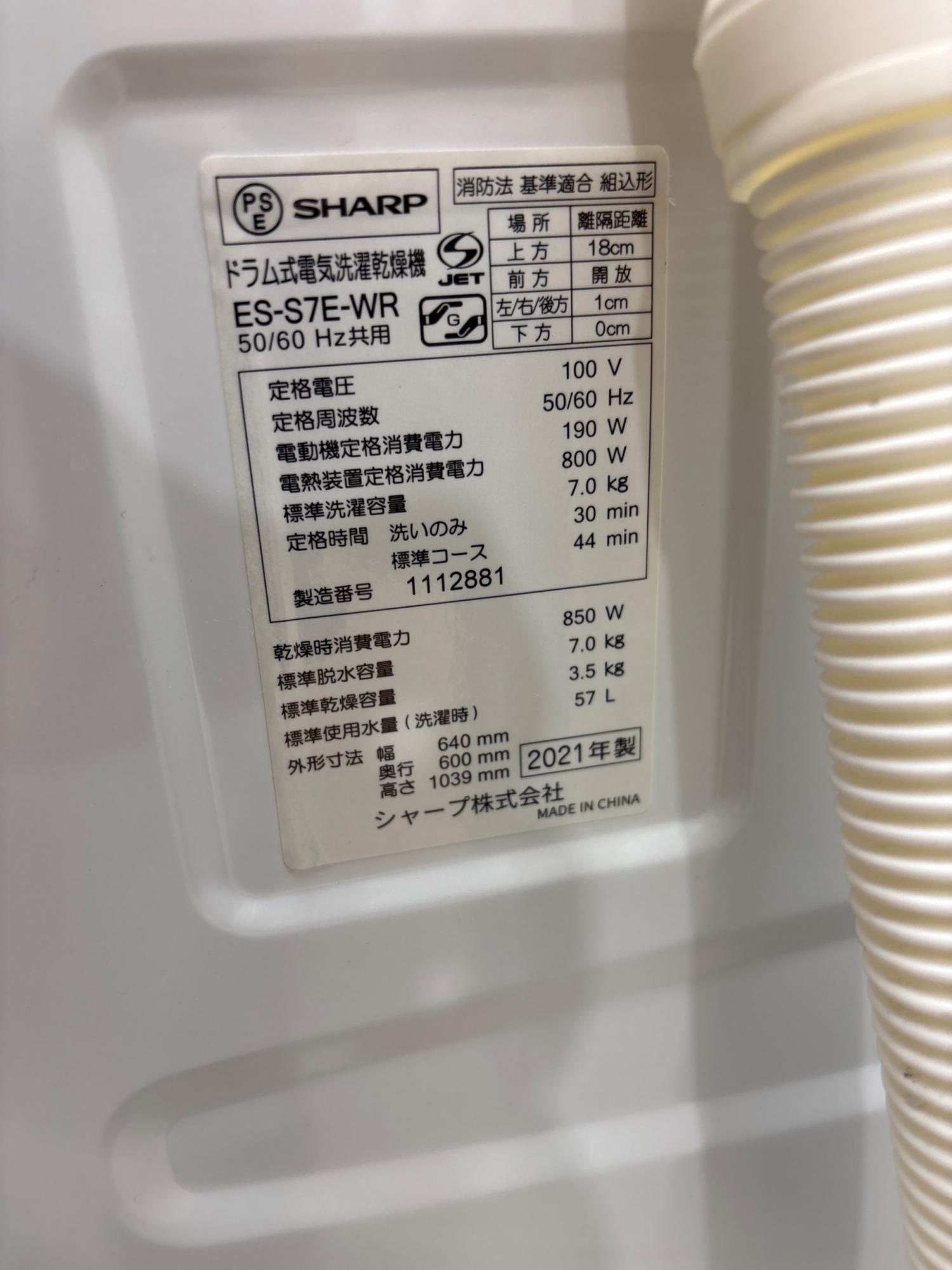 SHARP (シャープ) ドラム式洗濯乾燥機 7.0kg 3.5Kg ES-S7E-WR 2021年製 クリーニング済