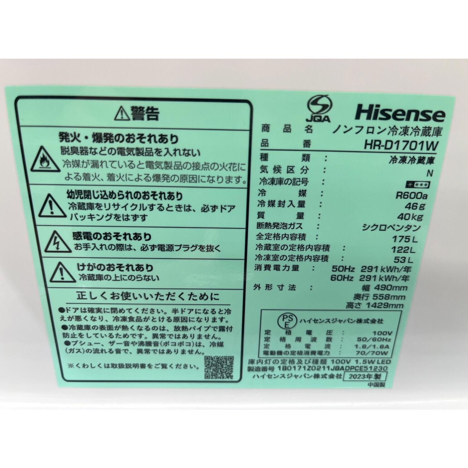 Hisense (ハイセンス) 2ドア冷蔵庫 HR-D1701W 2023年製 175L