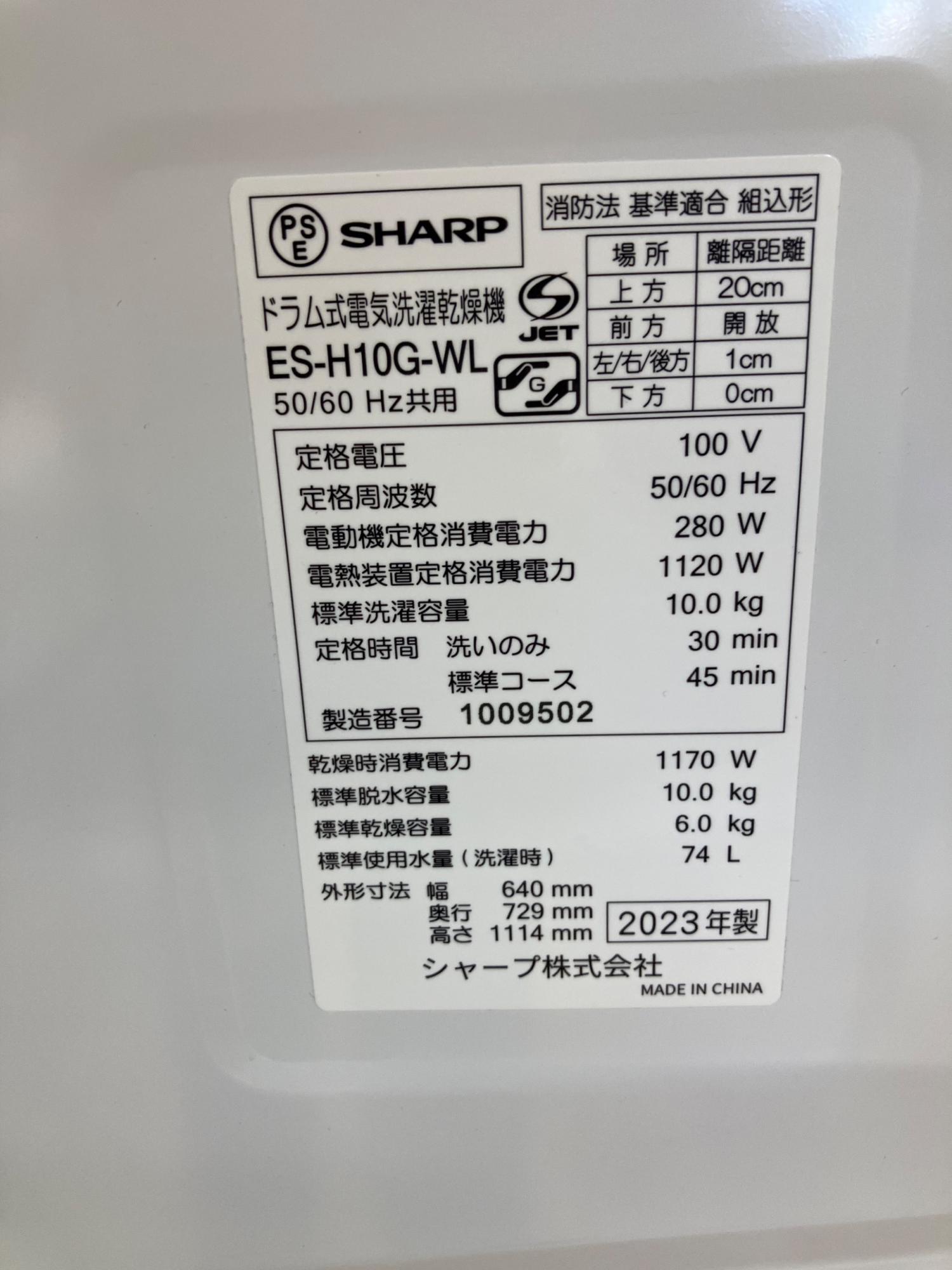 SHARP (シャープ) ドラム式洗濯乾燥機 ES-H10G-WL 2023年製