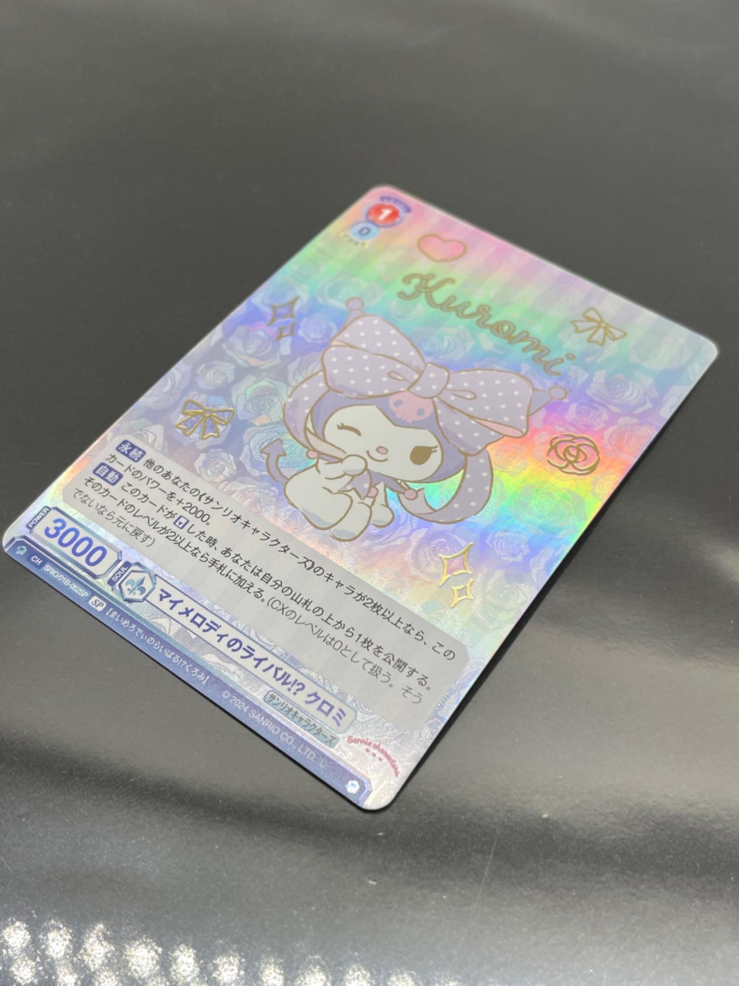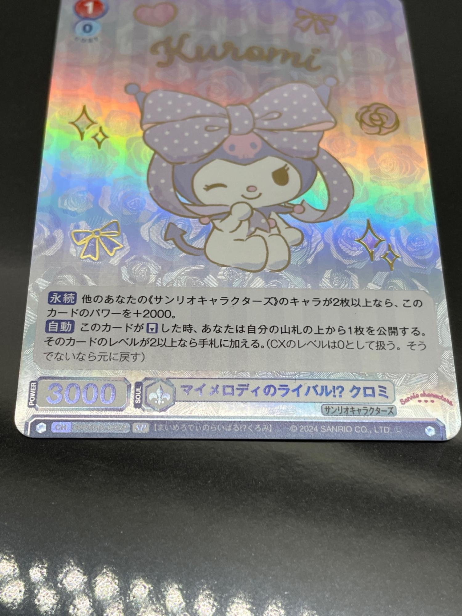 こちらのカードは、ブースターパック『サンリオキャラクターズ』で登場したキャラカードとなっており、味方の「サンリオキャラクターズ」が2人以上いる時にパワーが上昇する永続能力と、自身のリバース時に自分デッキトップを公開し、レベル2以上であれば手札に加えられる能力を有しています。ウィンクを決めたクロミの姿が愛らしい1枚です。
