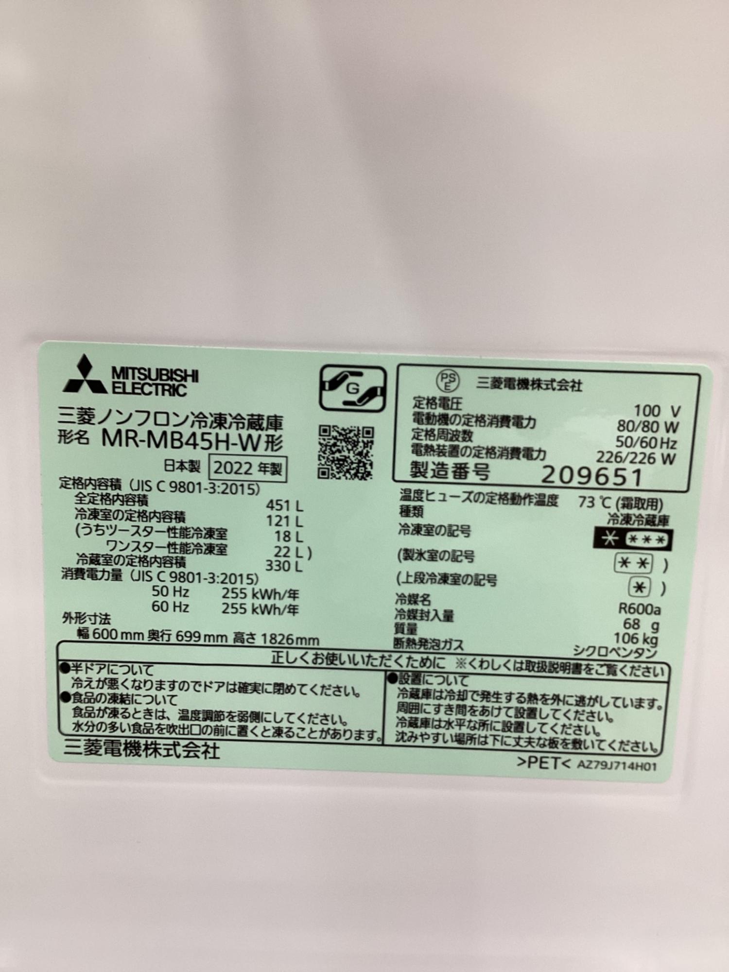 MITSUBISHI (ミツビシ) 5ドア冷蔵庫 451L 2022年製 MR-MB45H-W