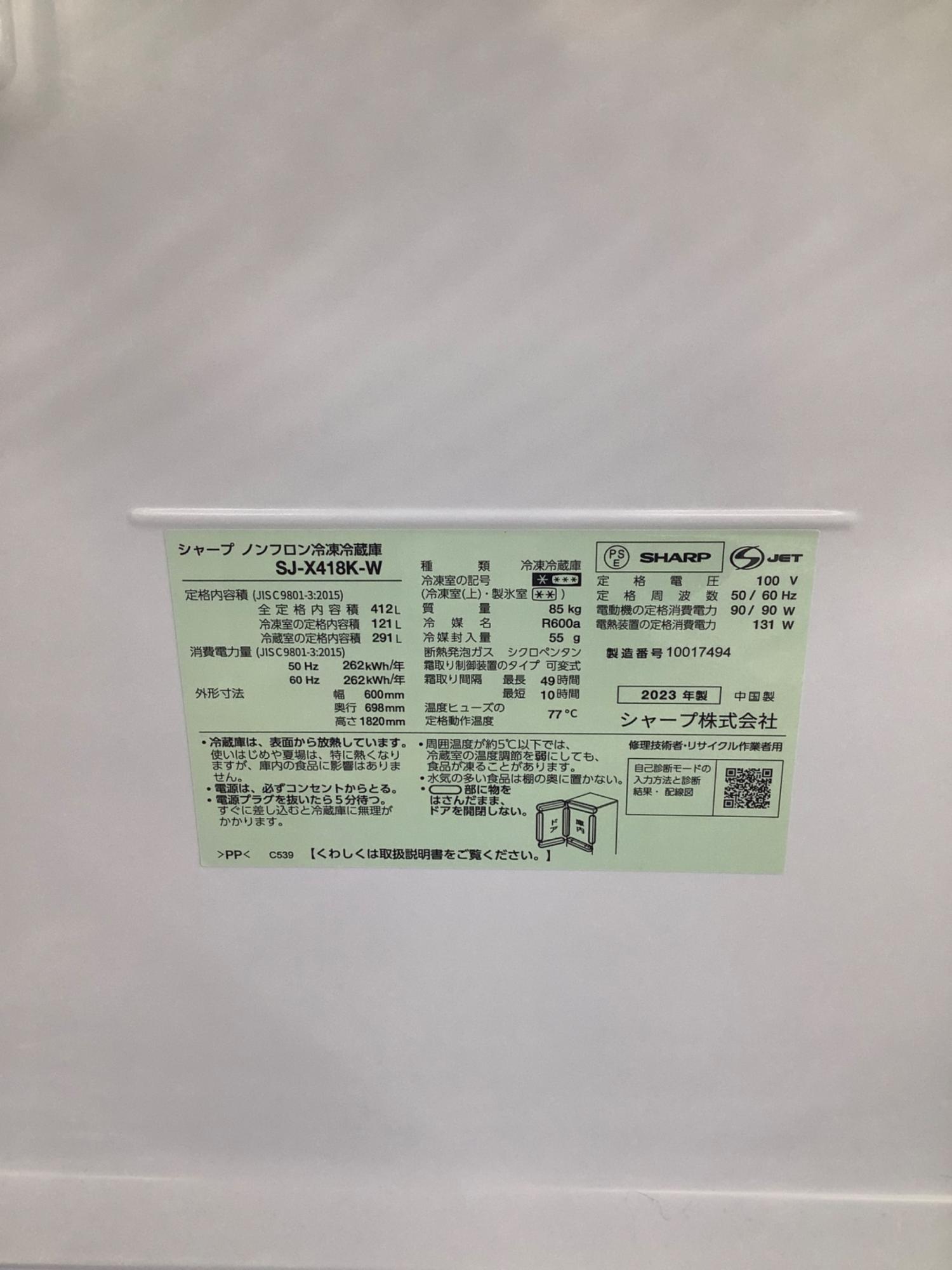 SHARP (シャープ) 5ドア冷蔵庫 SJ-X418K-W 2023年製 自氷付き 412L
