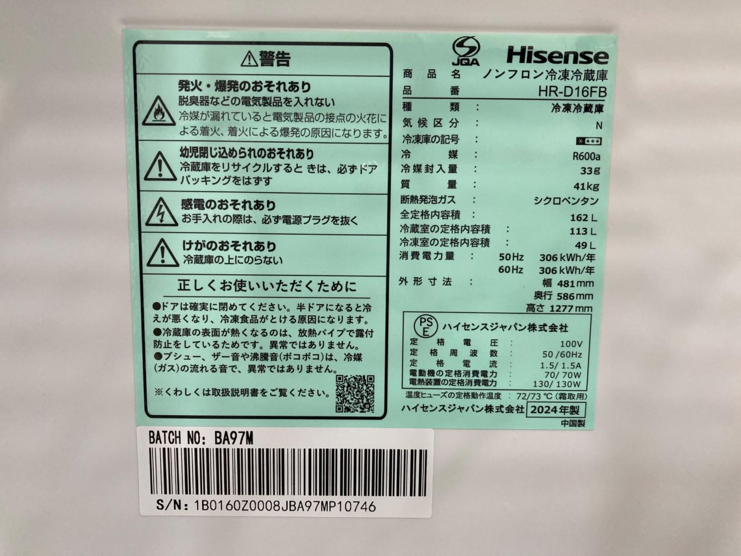Hisense (ハイセンス) 2ドア冷蔵庫 HR-D16FB 2024年製 162L
