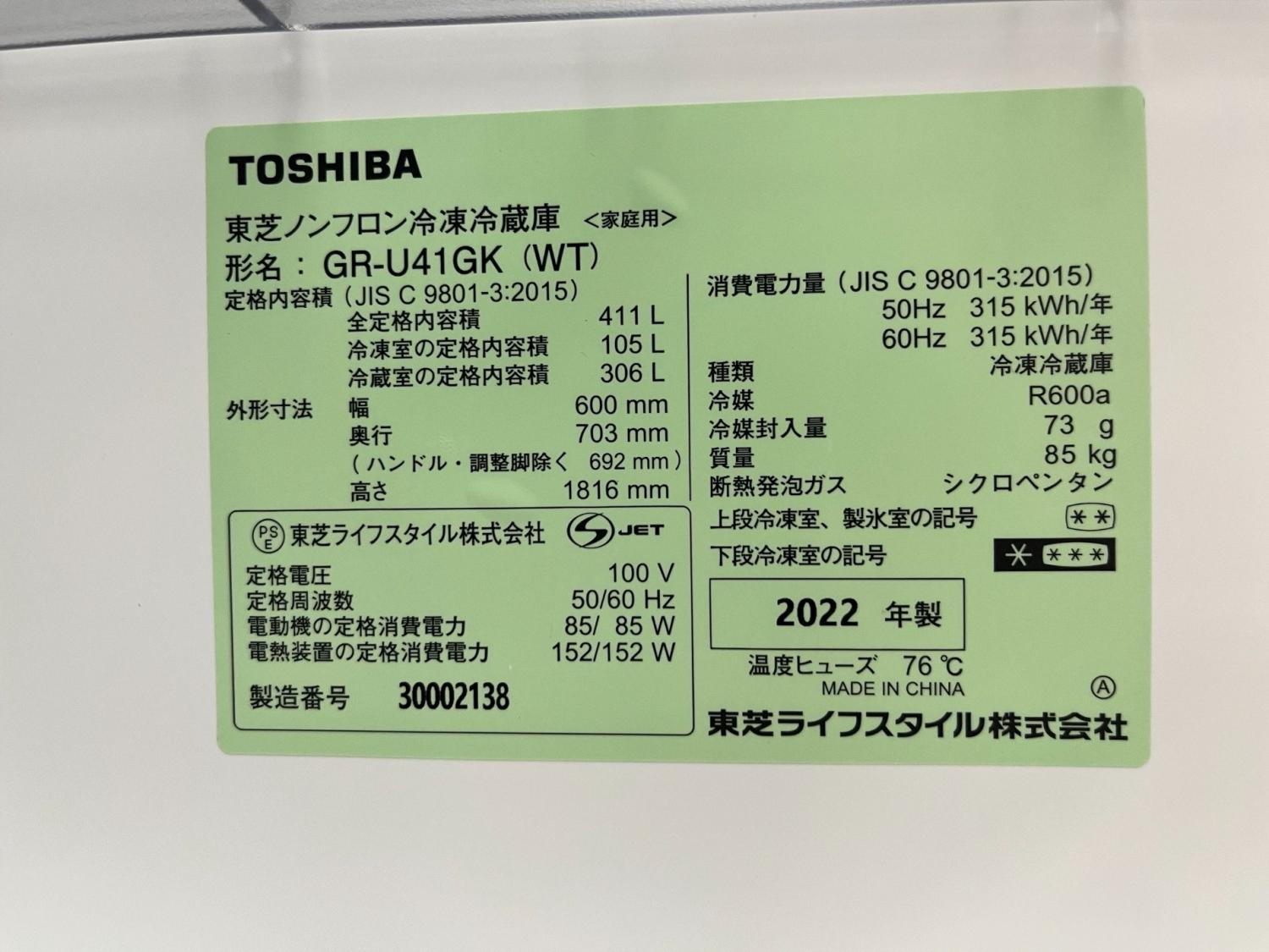 TOSHIBA (トウシバ) 5ドア冷蔵庫 GR-U41GK 2022年製 411L