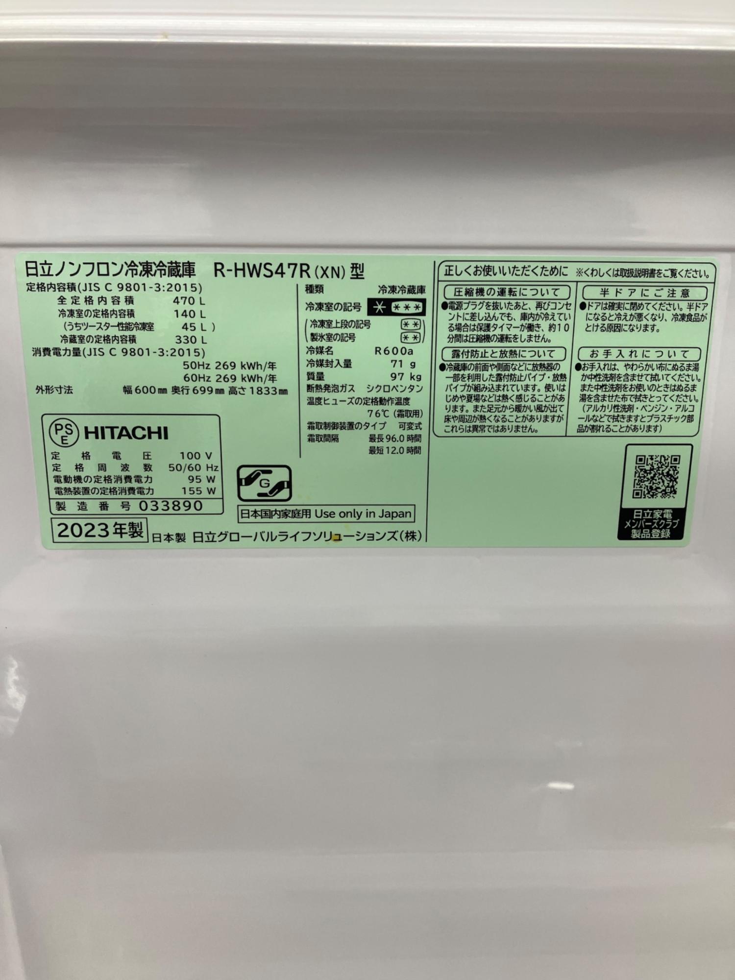 HITACHI (ヒタチ) 5ドア冷蔵庫 R-HWS47R 2023年製 470L