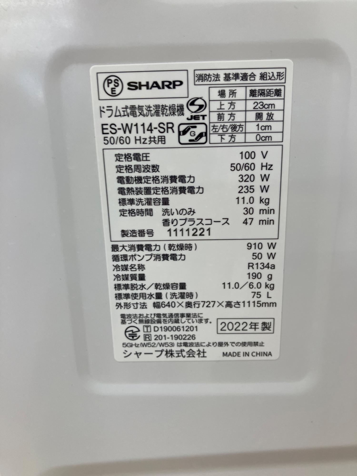 SHARP (シャープ) ドラム式洗濯乾燥機 洗濯11kg 乾燥6kg 2022年製 ES-W114-SR