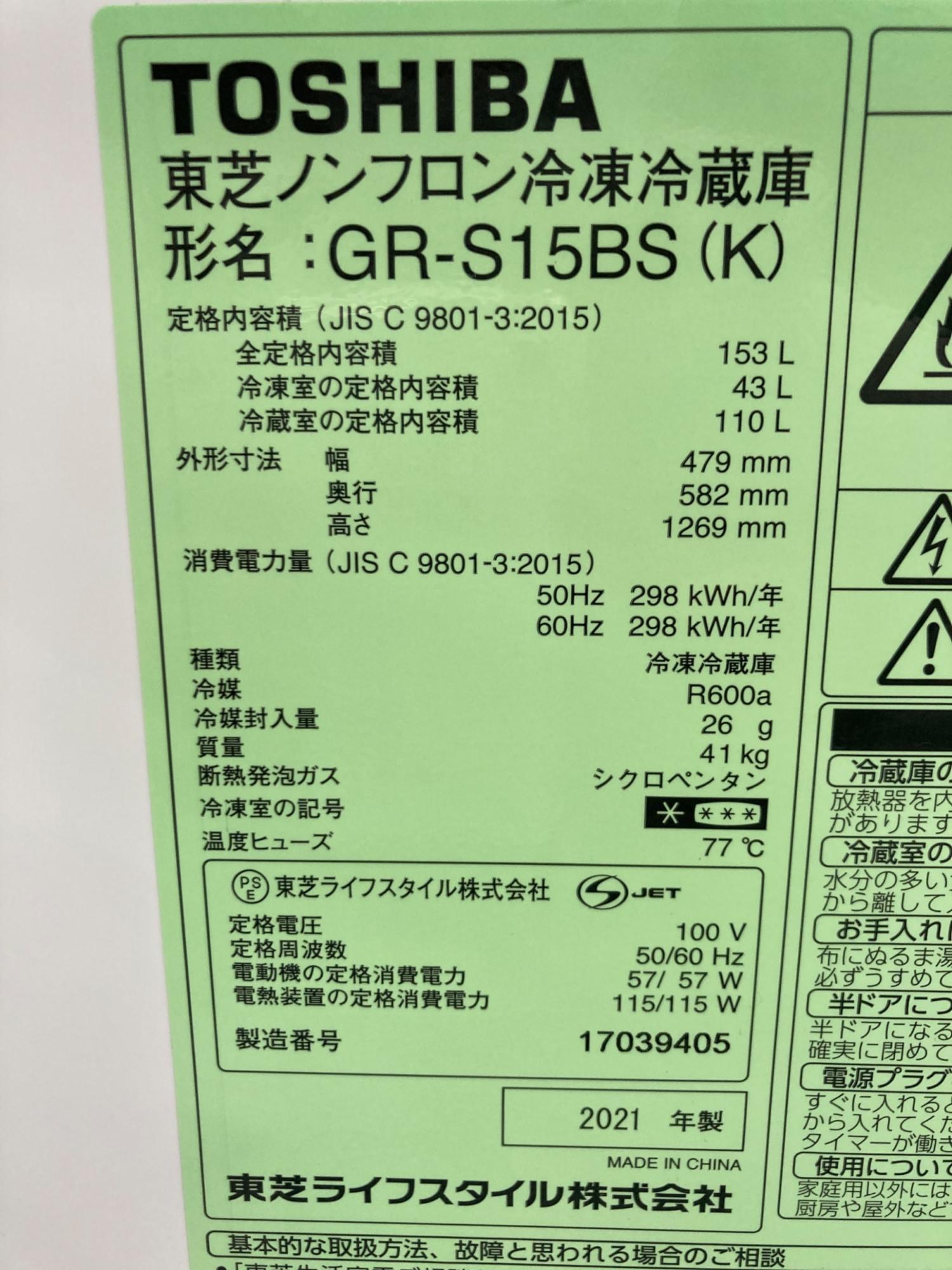 TOSHIBA (トウシバ) 2ドア冷蔵庫 GR-S15BS 2021年製 153L