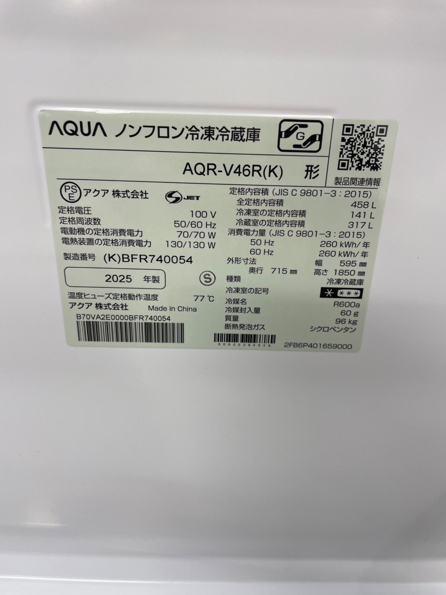 AQUA (アクア) 4ドア冷蔵庫 AQR-V46R 2025年製 自動製氷/急速製氷/急速冷凍 458L