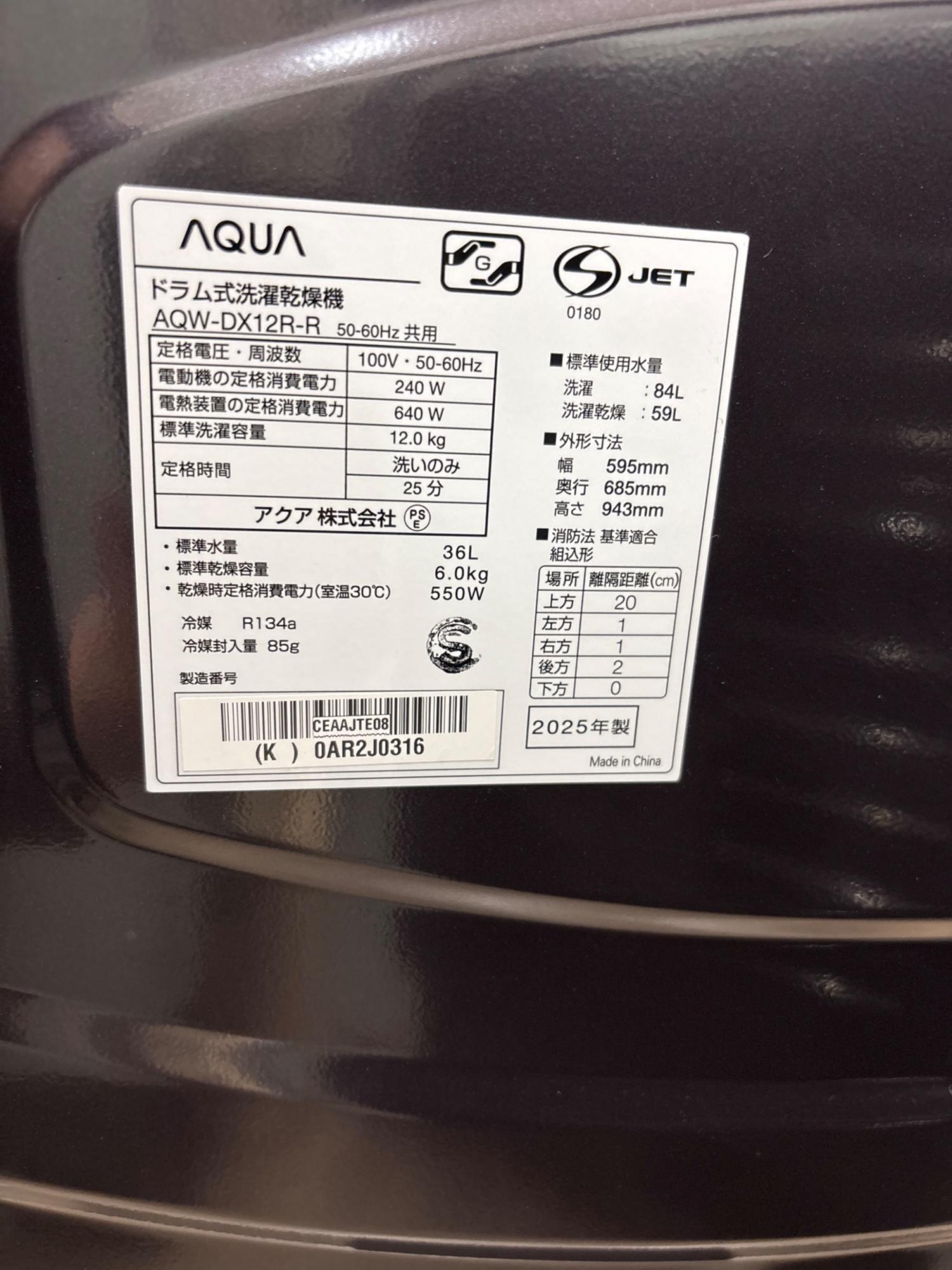 AQUA (アクア) ドラム式洗濯乾燥機 12.0kg 6.0kg AQW-DX12R-R(K) 2025年製 リファービッシュ品 クリーニング済