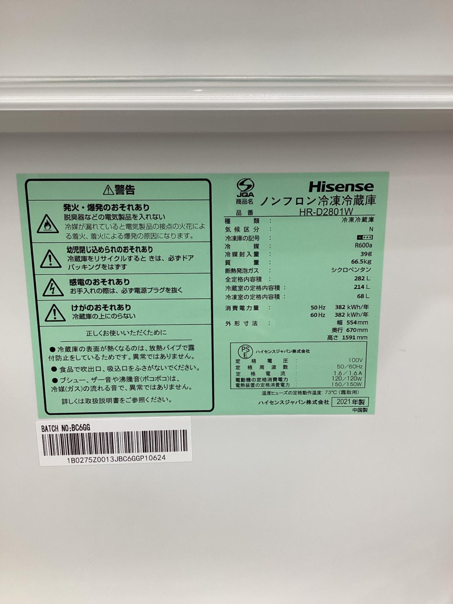 Hisense (ハイセンス) 3ドア冷蔵庫 HR-D2801W 2021年製 282L