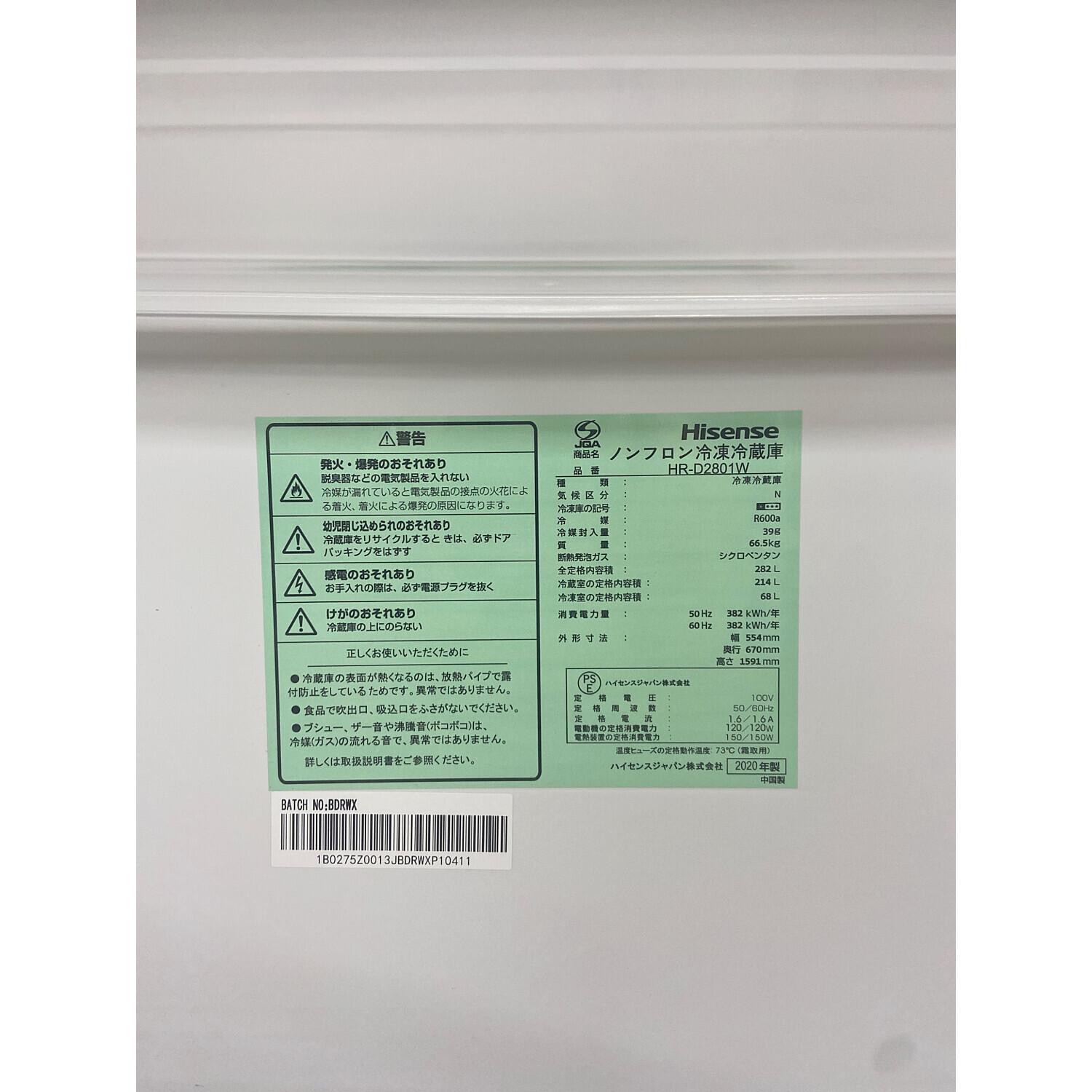 Hisense (ハイセンス) 3ドア冷蔵庫 HR-D2801W 2020年製 282L