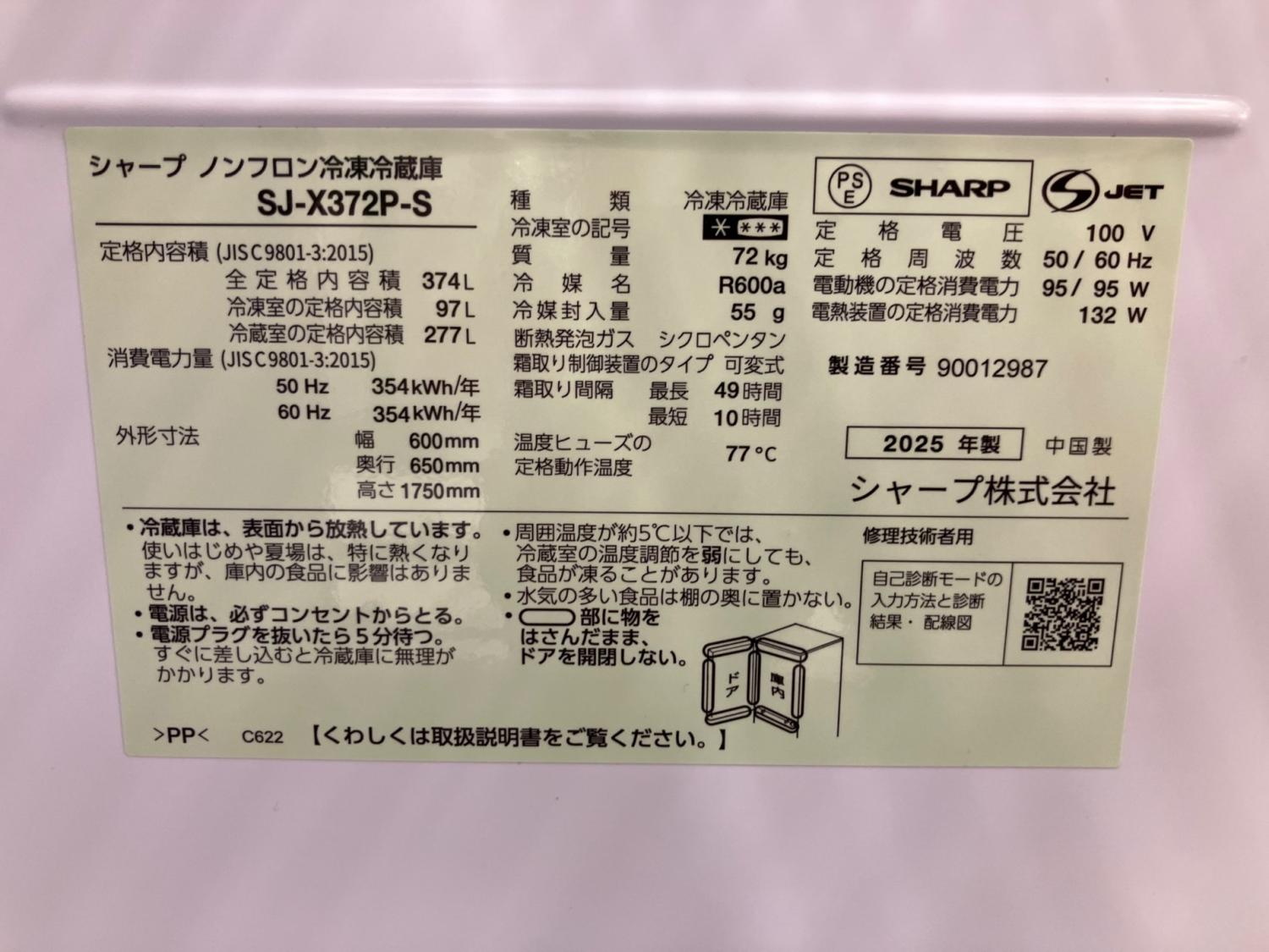 SHARP (シャープ) 3ドア冷蔵庫 SJ-X372P-S 2025年製 正面ヨゴレ小有り 374L