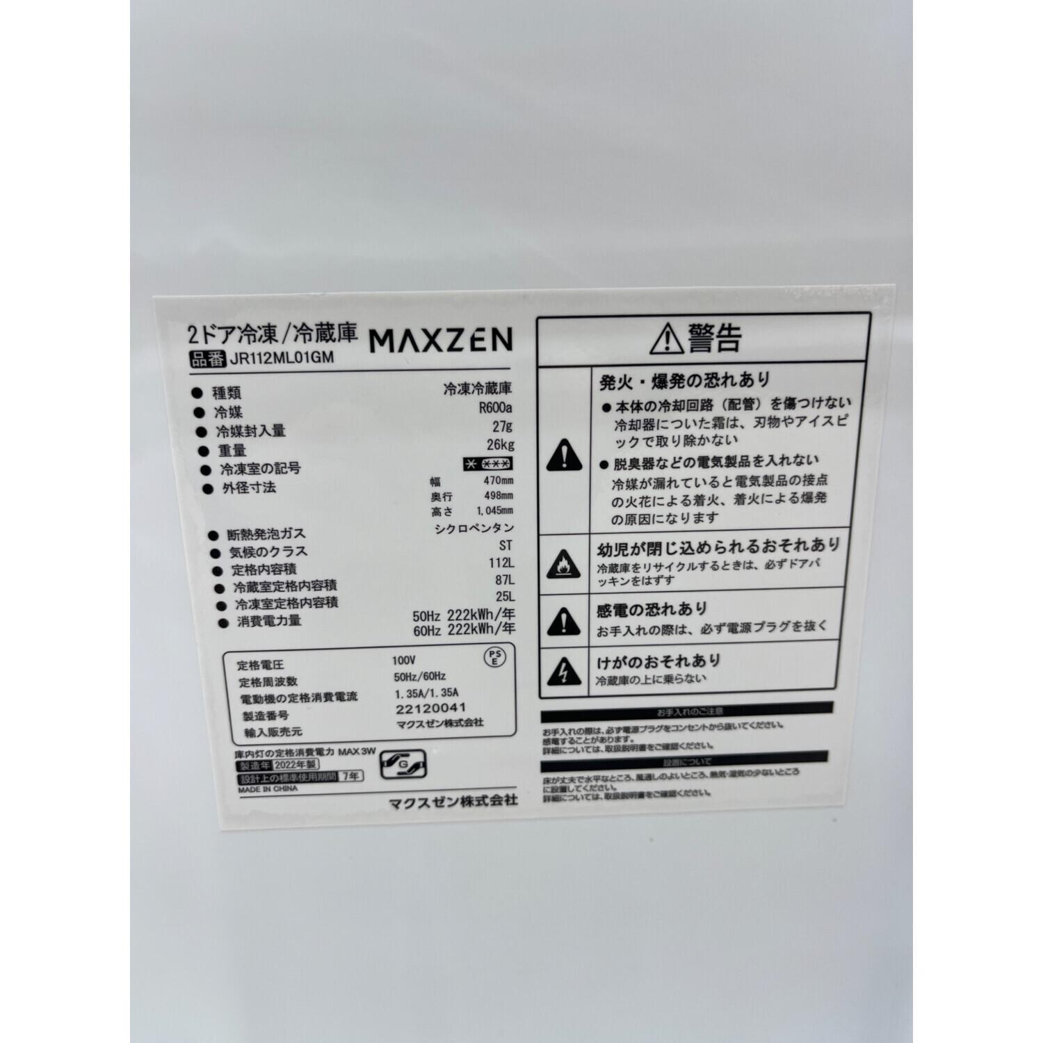 maxzen (マクスゼン) 2ドア冷蔵庫 JR112ML01GM 2022年製 112L