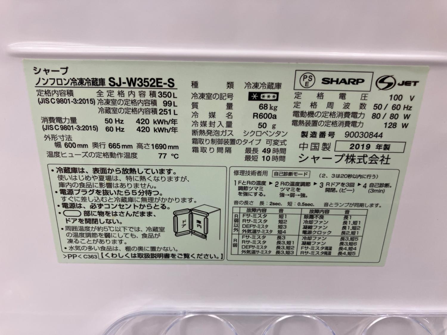 SHARP (シャープ) 3ドア冷蔵庫 SJ-W352E 2019年製 350L