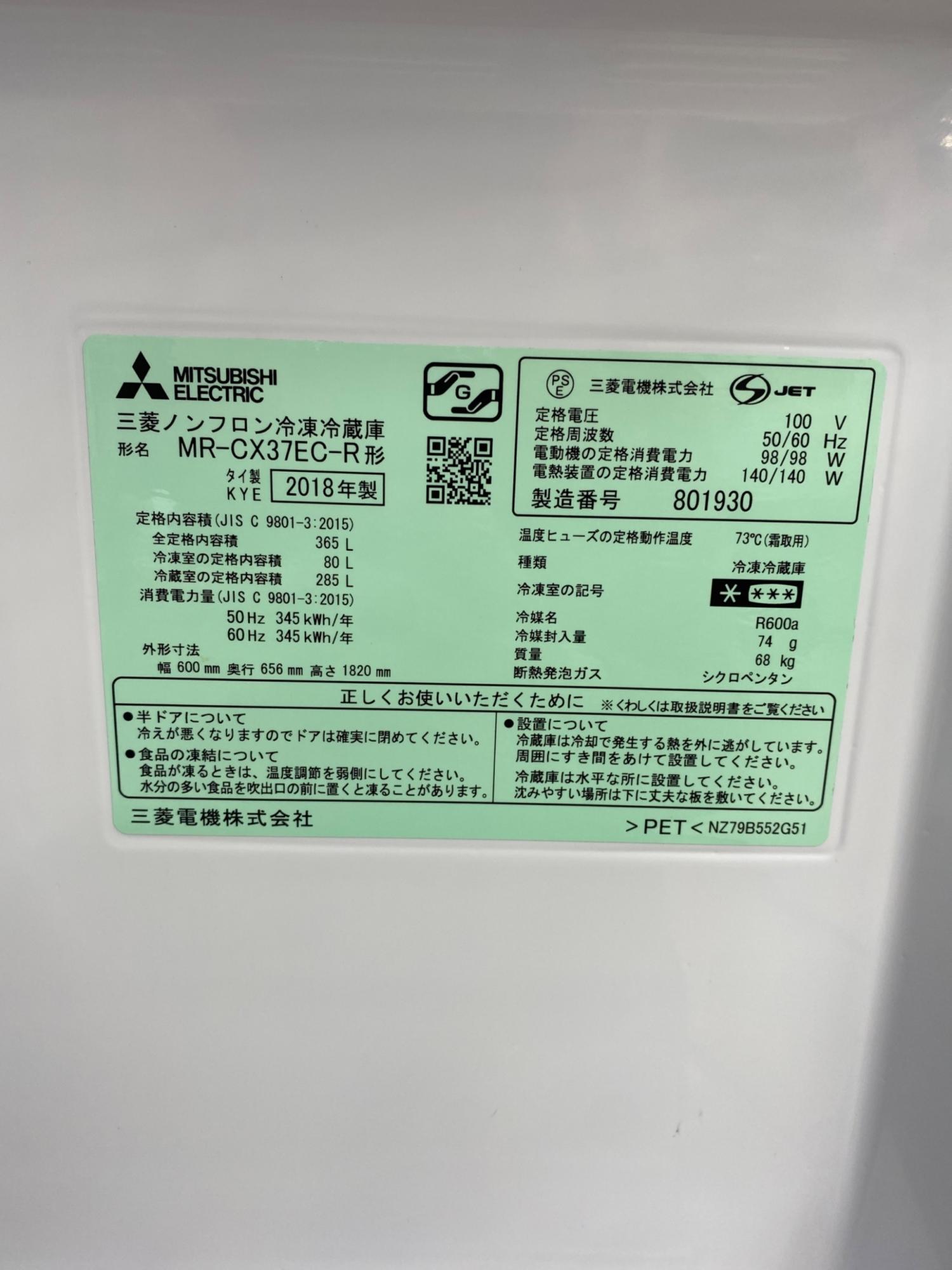 MITSUBISHI (ミツビシ) 3ドア冷蔵庫 MR-CX37EC 2018年製 365L