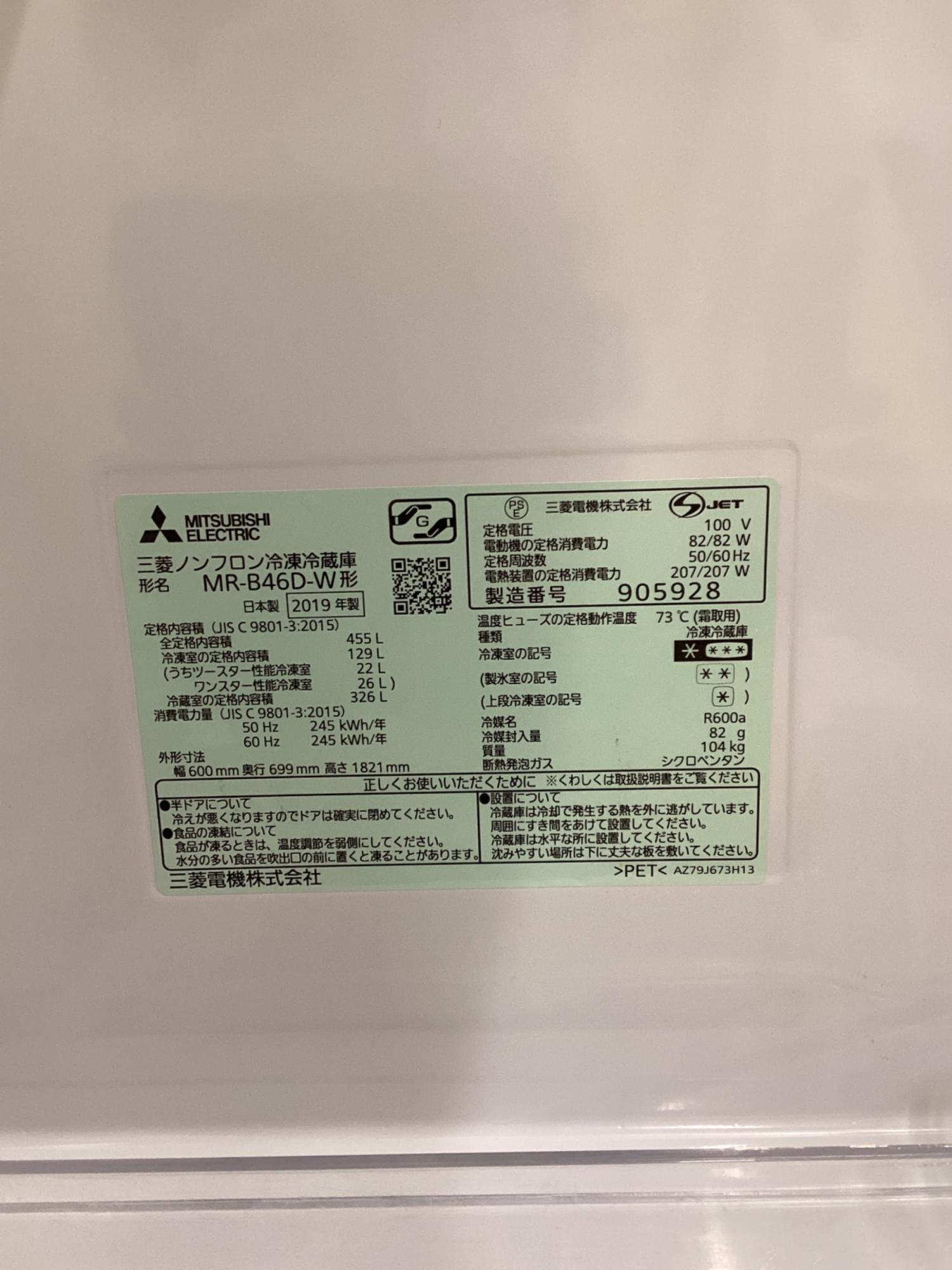 MITSUBISHI (ミツビシ) 5ドア冷蔵庫 MR-B46D-W 2019年製 455L