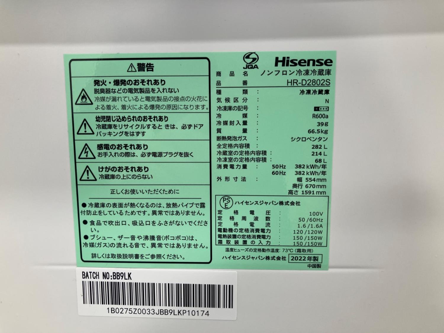 Hisense (ハイセンス) 3ドア冷蔵庫 HR-D2802S 2022年製 282L