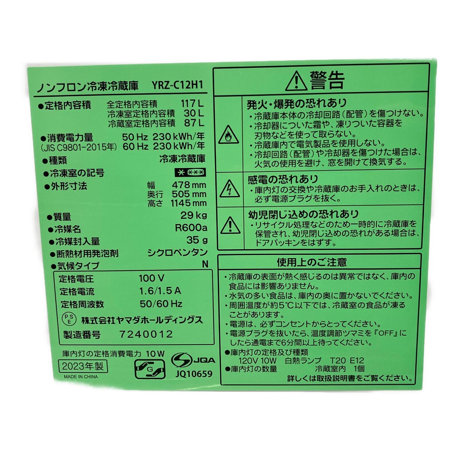 YAMADA (ヤマダオリジナル) 2ドア冷蔵庫 ● YRZ-C12H1 2023年製 117L 30L クリーニング済