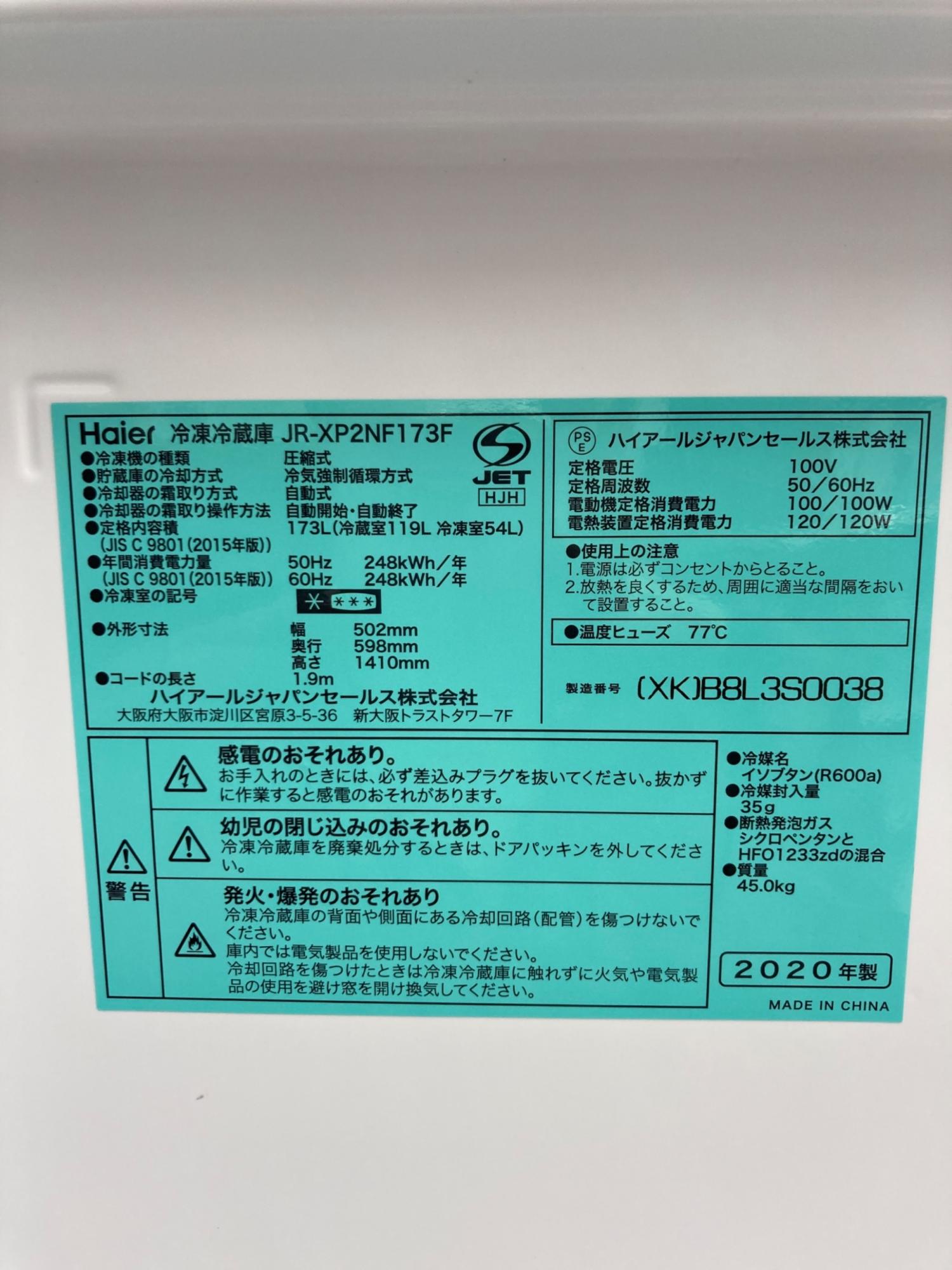 Haier (ハイアール) 2ドア冷蔵庫 JR-XP2NF173F 2020年製 173L