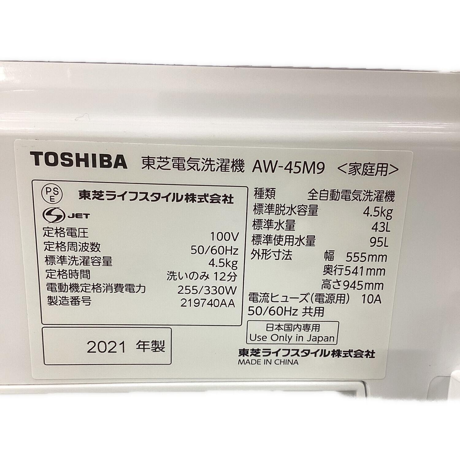 TOSHIBA (トウシバ) 洗濯機 4.5kg AW-45M9 2021年製 クリーニング済