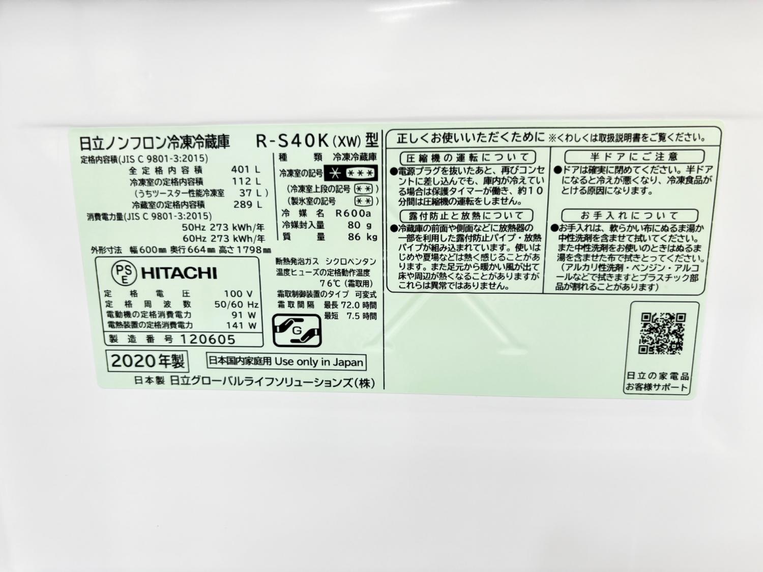 HITACHI (ヒタチ) 5ドア冷蔵庫 R-S40K 2020年製 401L クリーニング済