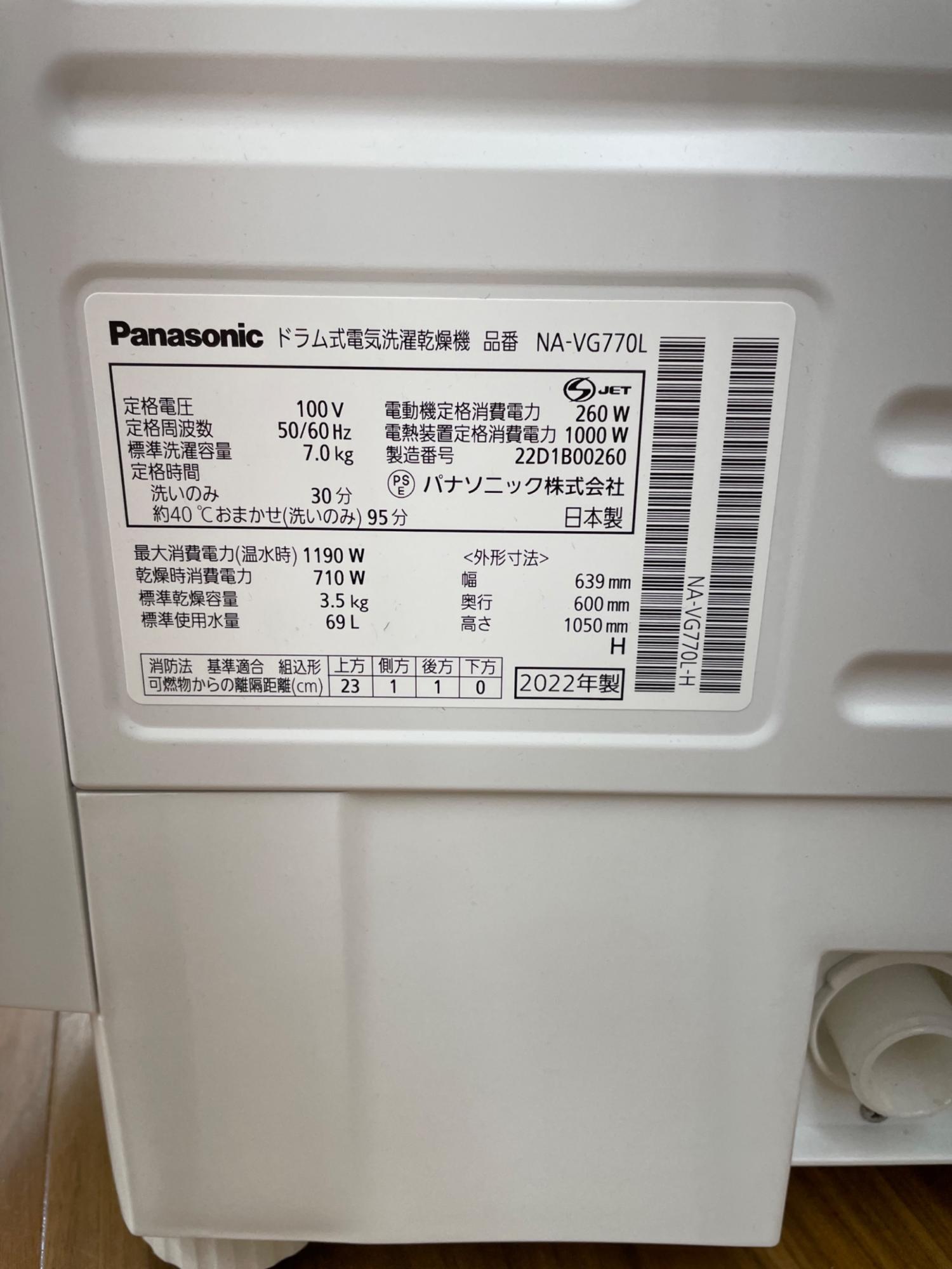 Panasonic (パナソニック) ドラム式洗濯乾燥機 NA-VG770 7.0kg 2022年製