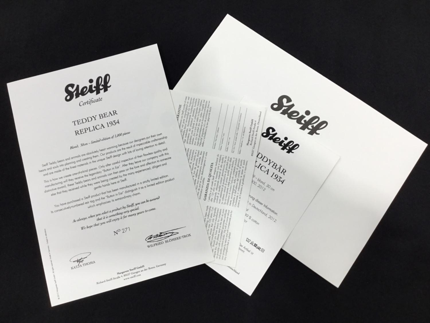 TEDDY BEAR REPLICA 1934(テディベアぬいぐるみ) 402999 Steiff(シュタイフ) 未使用品