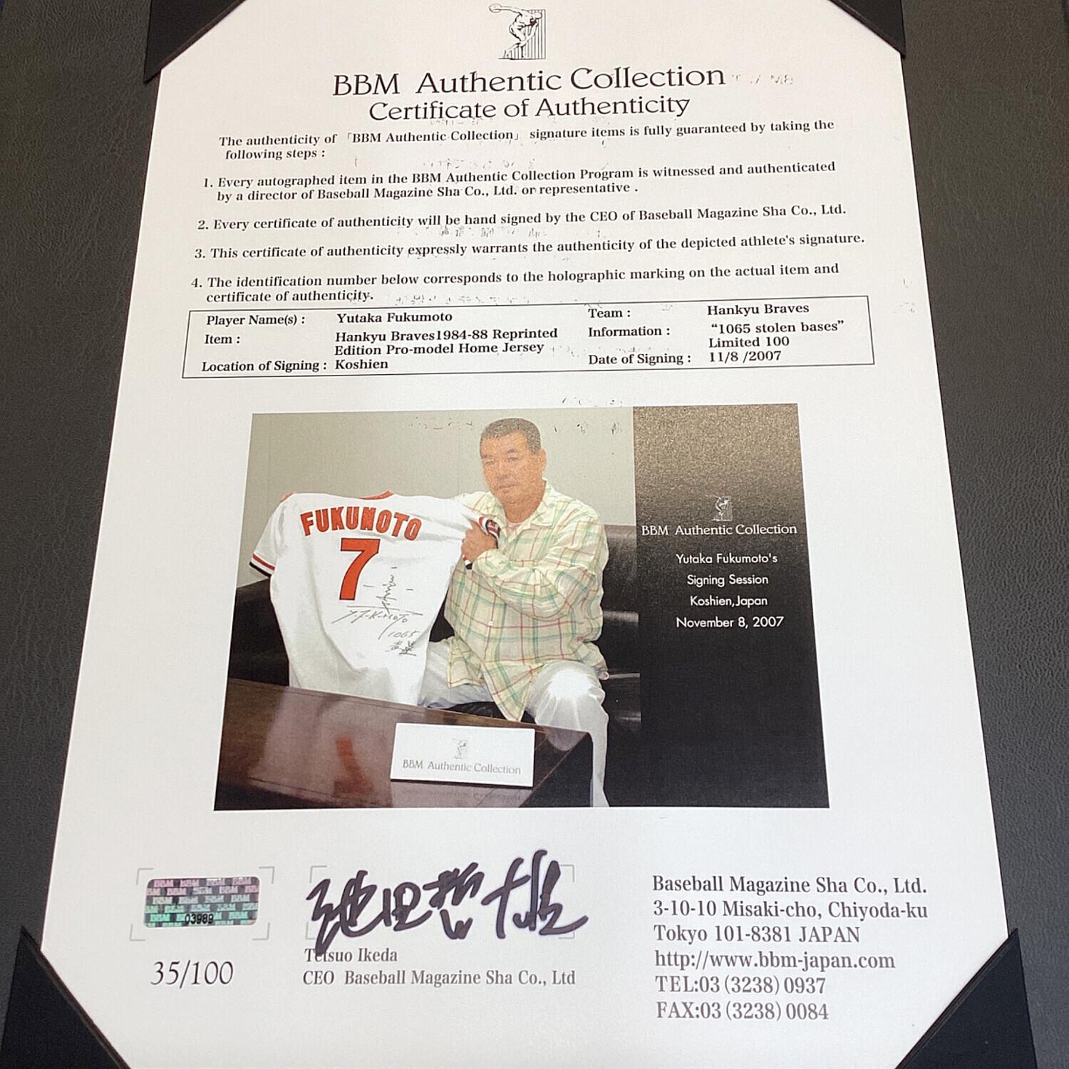 阪急ブレーブス (ハンキュウブレーブス) 応援グッズ ホワイト 【7】福本豊 ユニフォーム BBM Authentic Collection 100枚限定(35/100)直筆サイン入り 証明フォト付