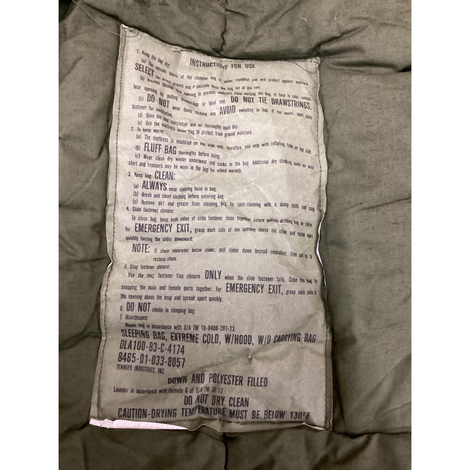 US軍 (ユーエスグン) マミー型シュラフ 1983年製/エクストリームコールド SLEEPING BAG, EXTREME COLD WEATHER, W/HOOD, W/O CARRYING BAG 【冬用】 約83×213㎝